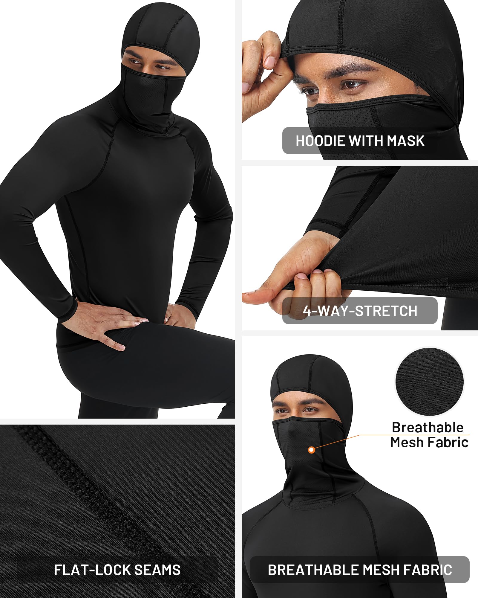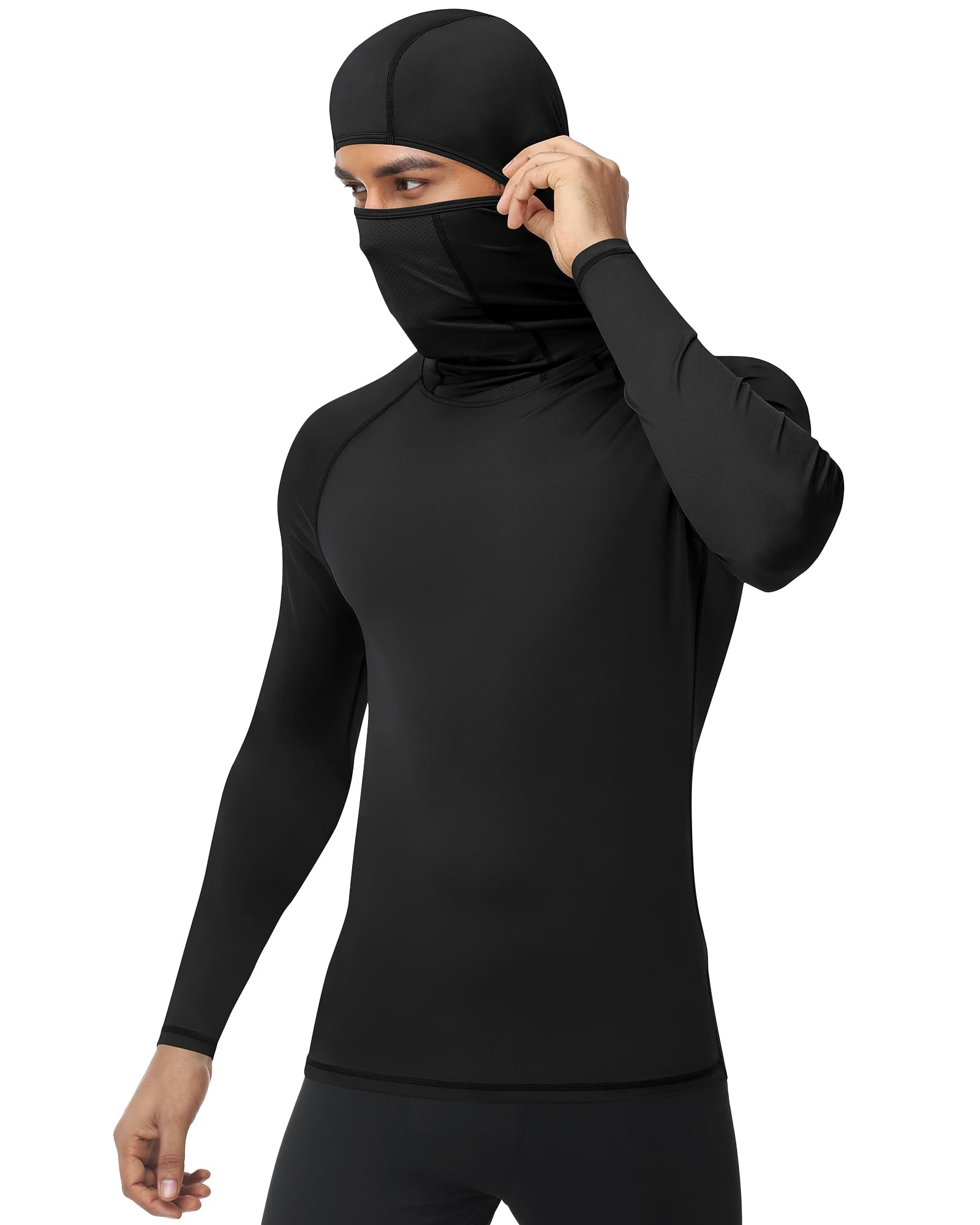 Runhit Thermal Compression Shirts for Men Long Sleeve Hoodie with Mask Running Base Layer Top Breathable Workout Sports Undershirts Black L