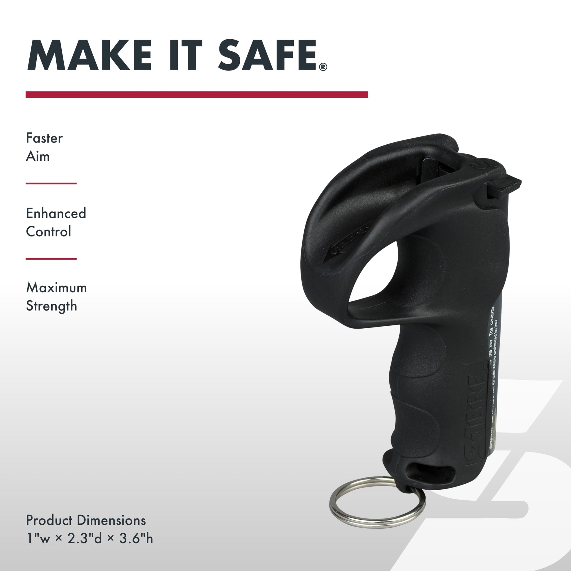 Details: The SABRE Pepper Spray with Quick Grip New User Kit delivers maximum strength personal protection with advanced aiming control—ideal for beginners and experienced users alike. Featuring a patented ergonomic finger loop design, it aligns instantly with your index finger for intuitive aiming. Finger grooves, a concave thumb rest, and a stream channel ensure a secure, safe grip. Safety features like a twist-lock, protective hood, and locking clip help prevent accidental discharge. Internal supports and an anti-rotation boss keep the canister firmly in place. A keychain attachment offers fast, on-the-go access, perfect for runners, commuters, students, and everyday carry. Compact, powerful, and easy to use—this is personal safety from SABRE®, the #1 trusted pepper spray brand. U.S. Patents: 11,644,284 and D950,001.