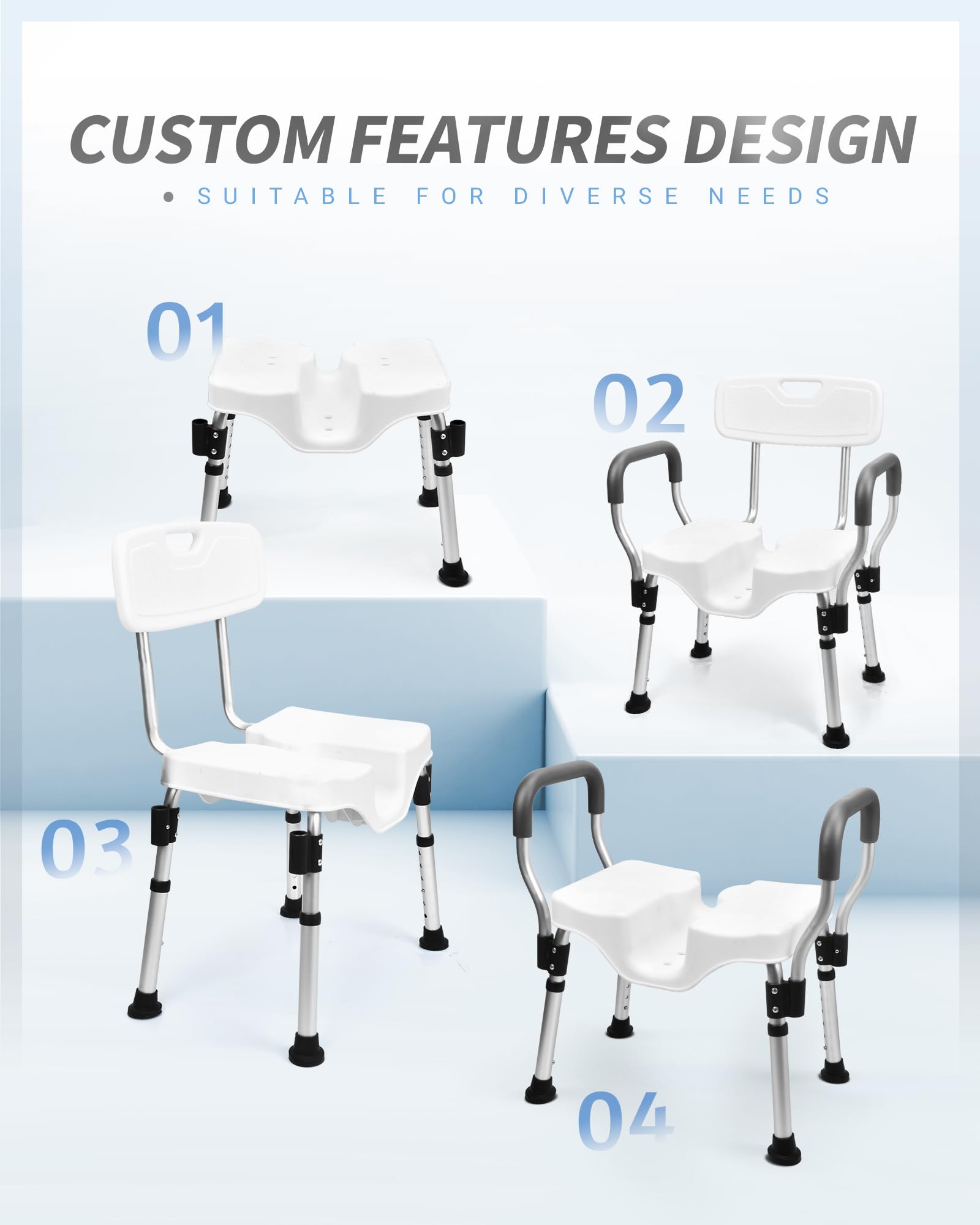 - **Heavy-duty Aluminum Frame**: Our latest model shower chair features a reinforced heavy-duty aluminum frame with a remarkable weight capacity of up to 500lbs, offering superior durability and stability.