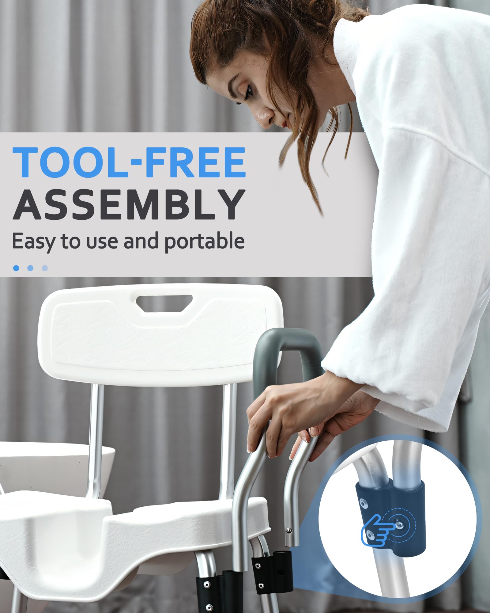 - **Customizable and User-Friendly**: With removable back and handles, as well as height-adjustable legs (27-inch to 33-inch), users can easily customize the shower chair to their specific preferences. Assembly is tool-free and hassle-free, with all necessary accessories included.