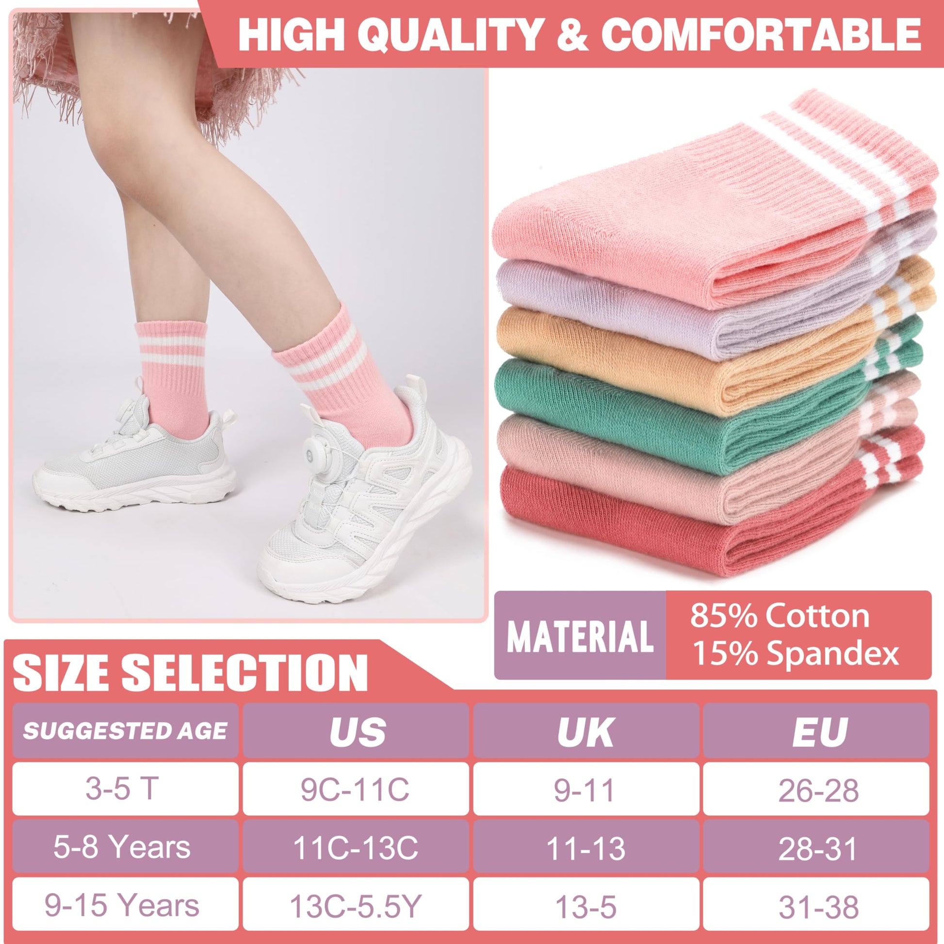 - 【Breathable Cotton】Made of 85% cotton and 15% spandex, these cotton crew socks are moisture wicking, which keep little feet cool and dry for all day comfort!