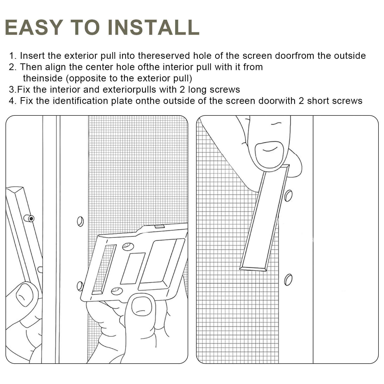 - Easy to install: You only need to insert the exterior handle from the outside into the reserved hole of the screen door, then align the center hole of the screen door interior handle with it from the inside (opposite to the exterior handle), and use 2 long screws to fix it, and finally use 2 short screws to fix the identification plate to the outside of the screen door