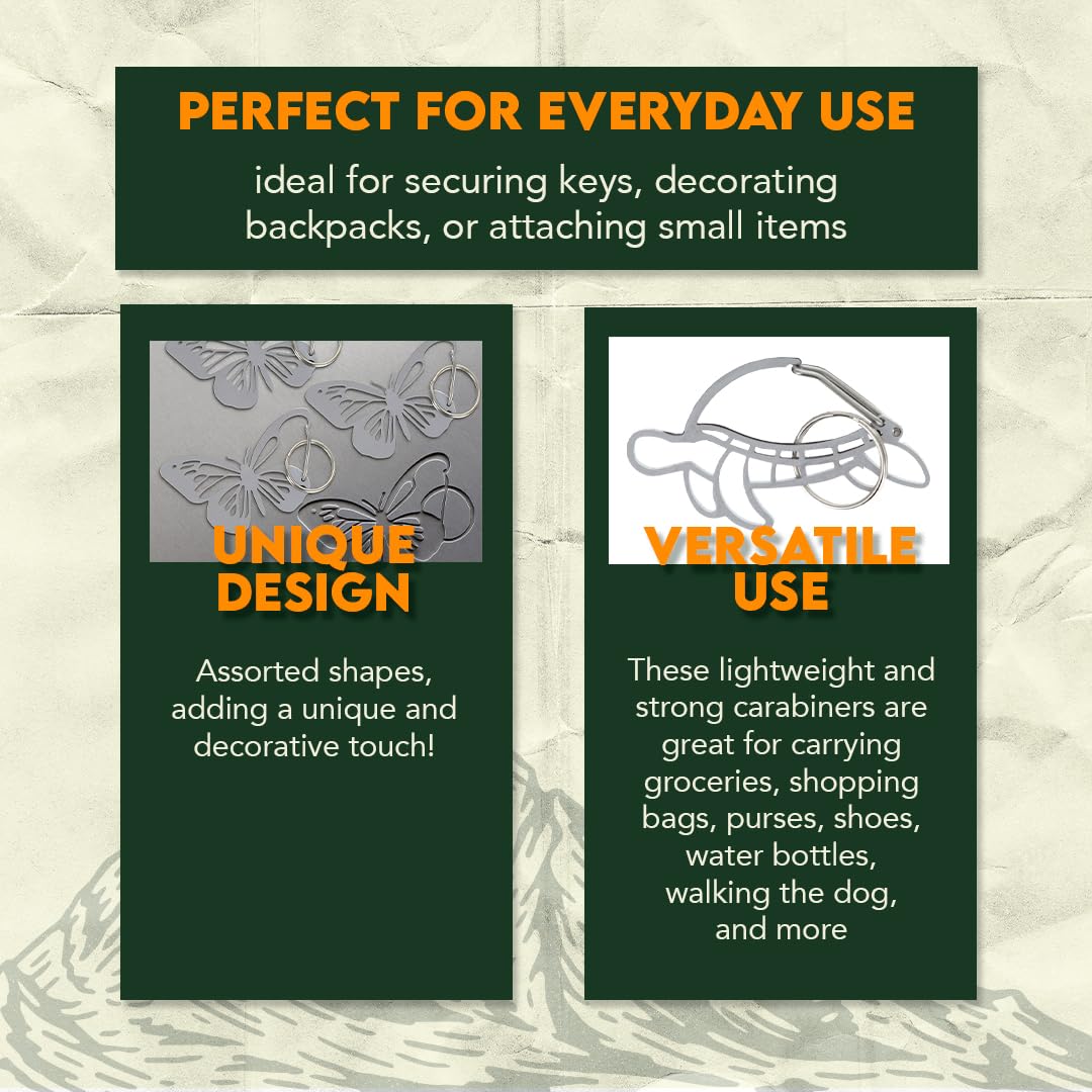 Details: Dimensions: Each carabiner measures 2.5" in height by 1.5" Material: Heavy stainless steel for durability and rust resistance Design: A unique and decorative touch Key Ring: Built-in for attaching keys, ID tags, or small accessories Usage: Perfect for everyday use, these carabiners are ideal for securing keys, decorating backpacks, or attaching small items. Not suitable for climbing or heavy-duty applications.