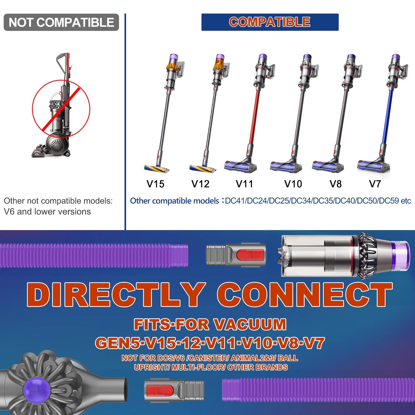 - [COMPATIBLE WITH DYSON]Feedback from many users after using our dryer vent cleaner. We know that many users have Dyson vacuum attachments. So we upgraded dryer vent cleaner kit - model V7 which compatibles nicely with the Dyson vacuum you are using. The adapter can compatible with Dyson V8 V10 V11 V15 V7 etc cordless vacuum cleaner. Note: Cannot be used with electrically driven tools or floors heads