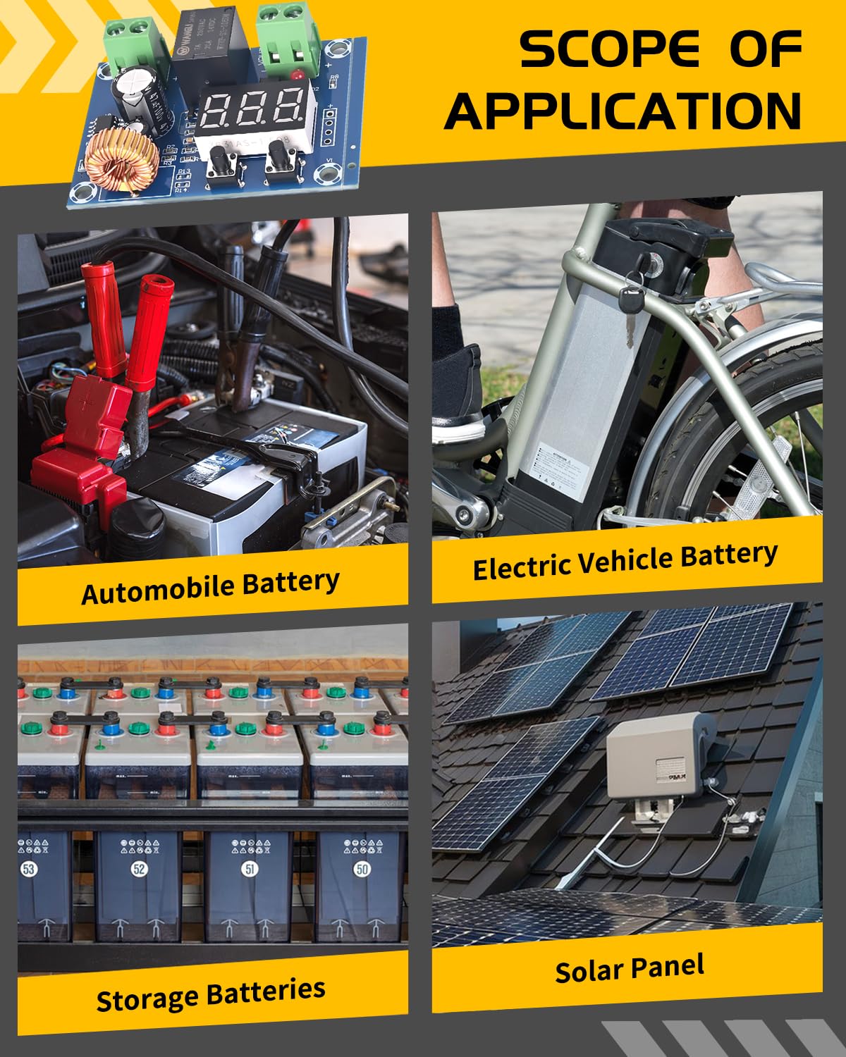 - FUNCTIONAL COVERAGE: This module operates as a voltage controller utilizing a relay-based mechanism to switch output power on/off. The relay serves exclusively as a switching component, maintaining the original voltage level without modification. Designed as a protective switching module, it does not integrate batteries. It is compatible with lead-acid batteries, lithium-ion batteries, and solar panel batteries (single units only)