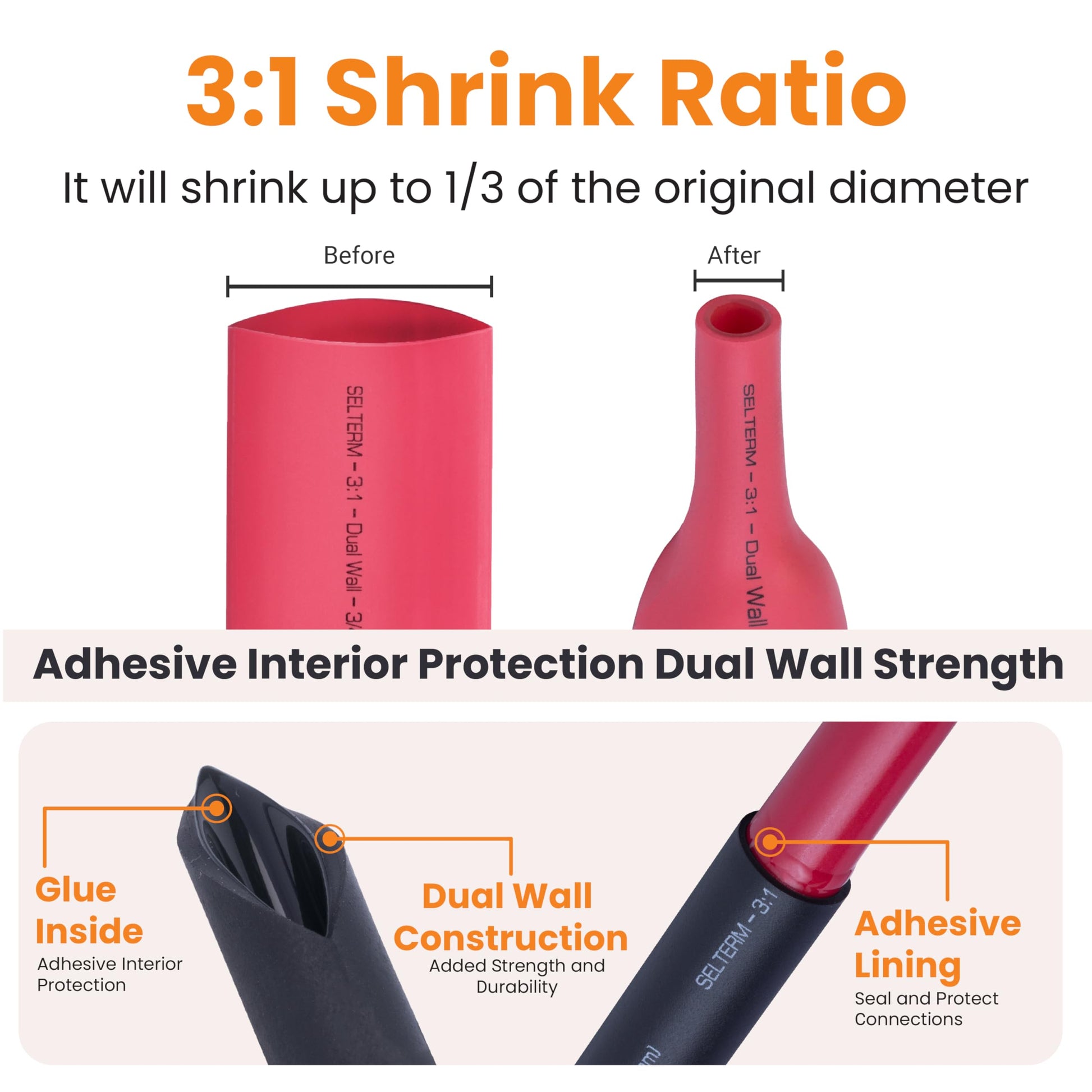 - Heat-Resistant Durability: The Selterm copper terminal connectors comes with 12pcs 3:1 black & red heat shrink tubing with adhesive. This tubing offers excellent insulation, protecting connections from heat, moisture, and corrosion, thus extending the life of your battery setup.
