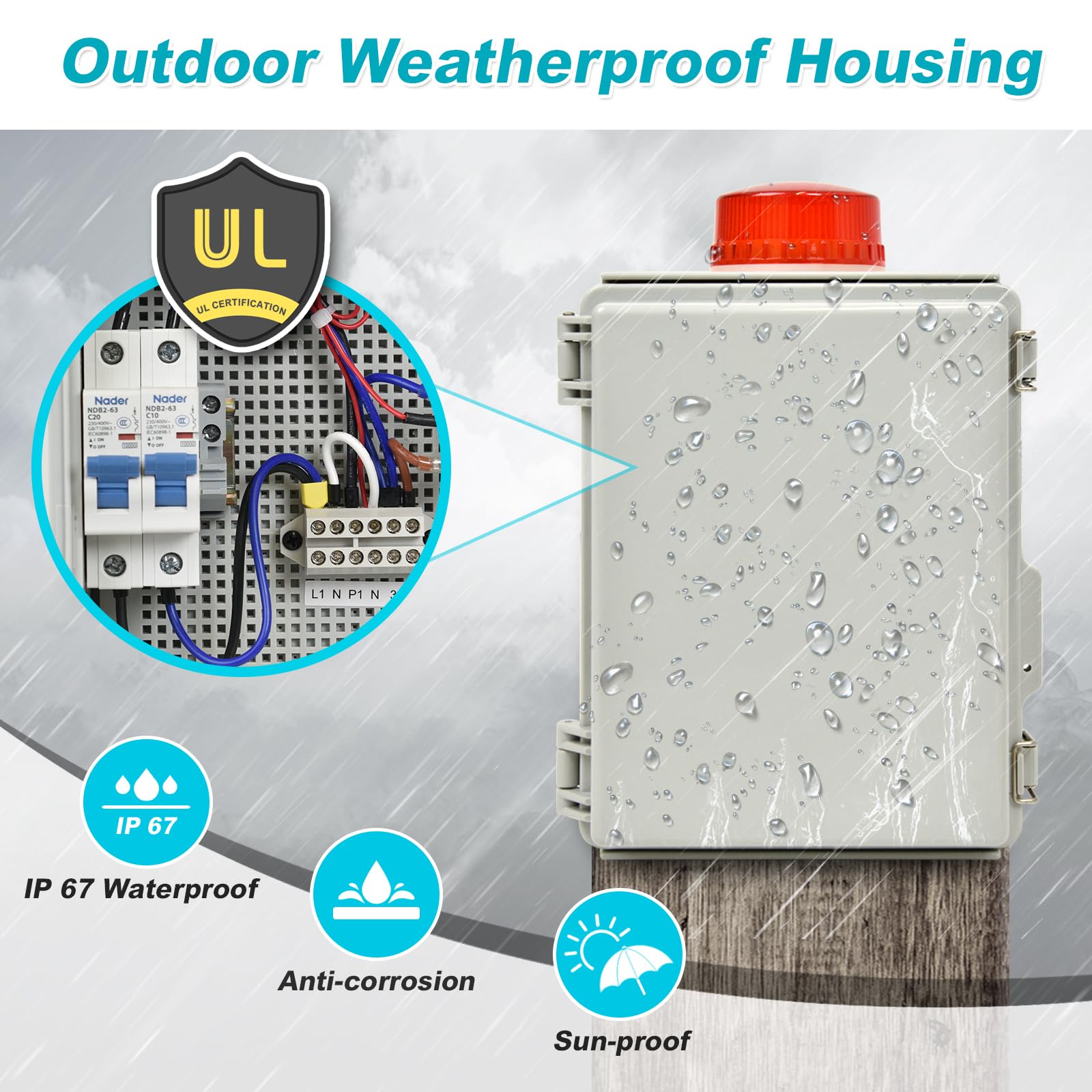 - DURABLE CASING AND CERTIFIED WIRING: The water level alarm comes with an IP67-rated weatherproof casing, allowing you to use it for an extended period in both indoor and harsh outdoor conditions without being eroded by the wind and rain. Furthermore, the wiring and circuit breaker are UL certified, ensuring their compliance with international safety standards, providing you with long-lasting reliability and safety