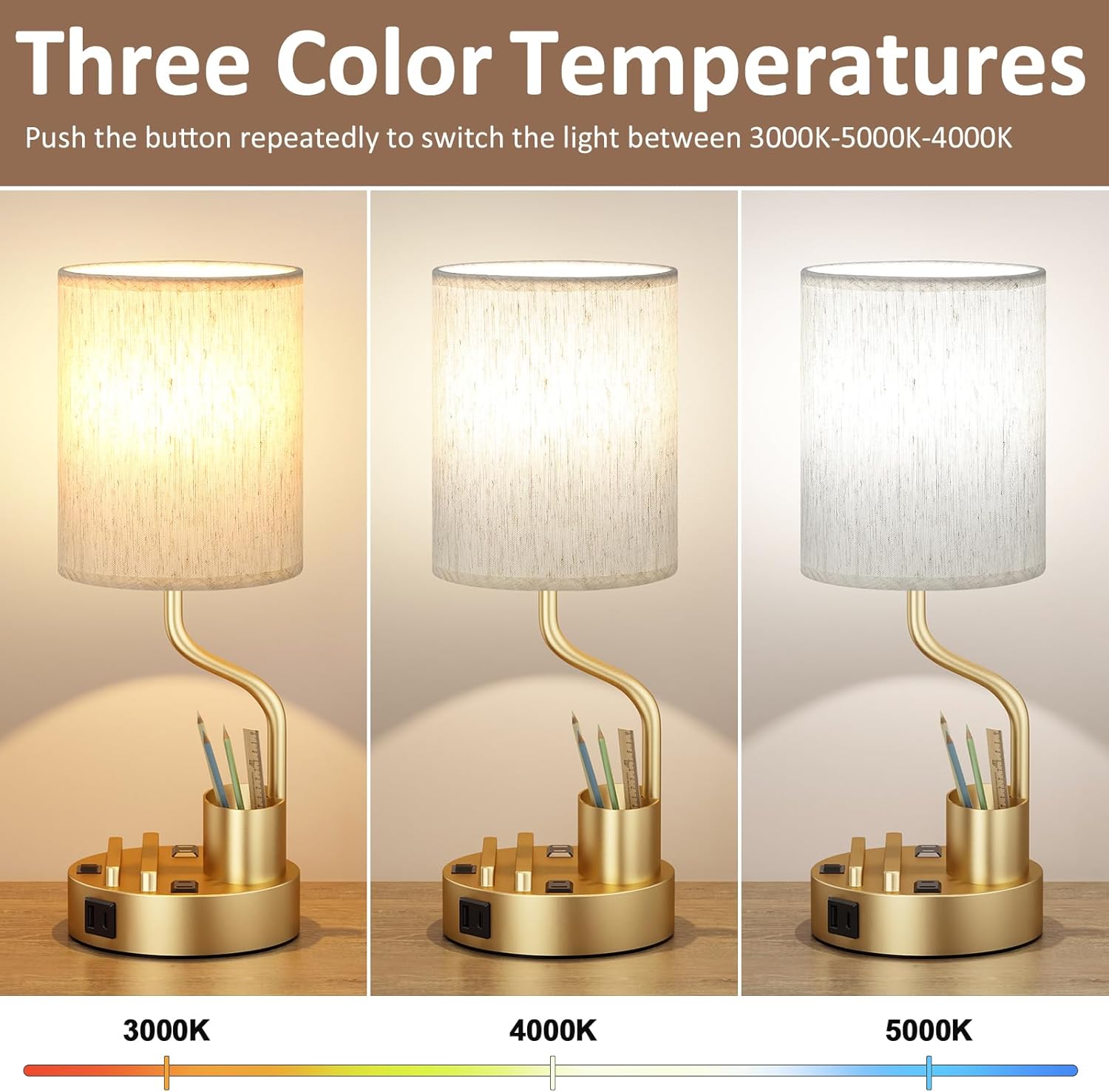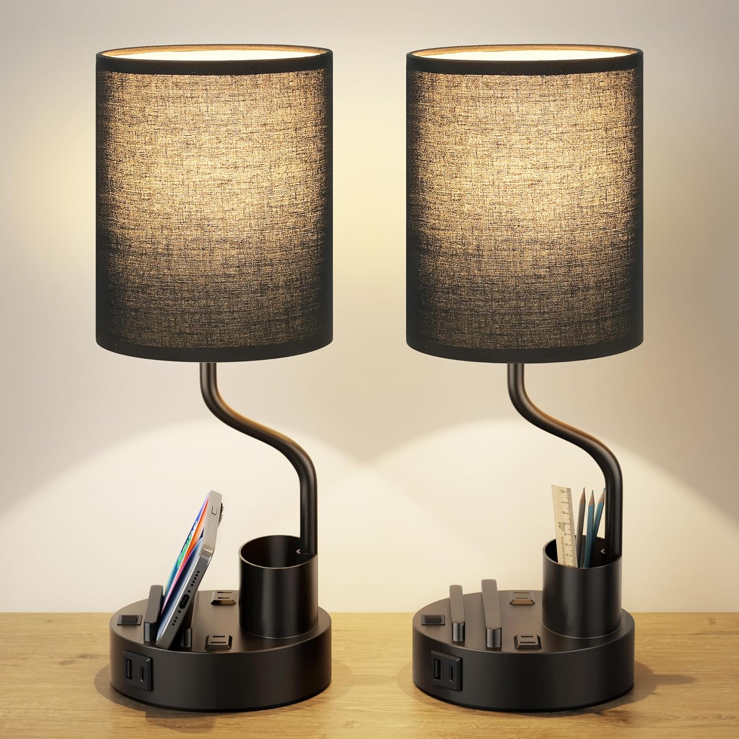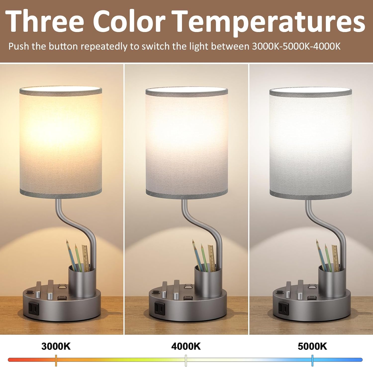 Set of 2 Bedside Table Lamps with USB & AC Outlet - 3 Color Temperatures, Desk Light & Phone Stand for Bedroom, Living Room, Office