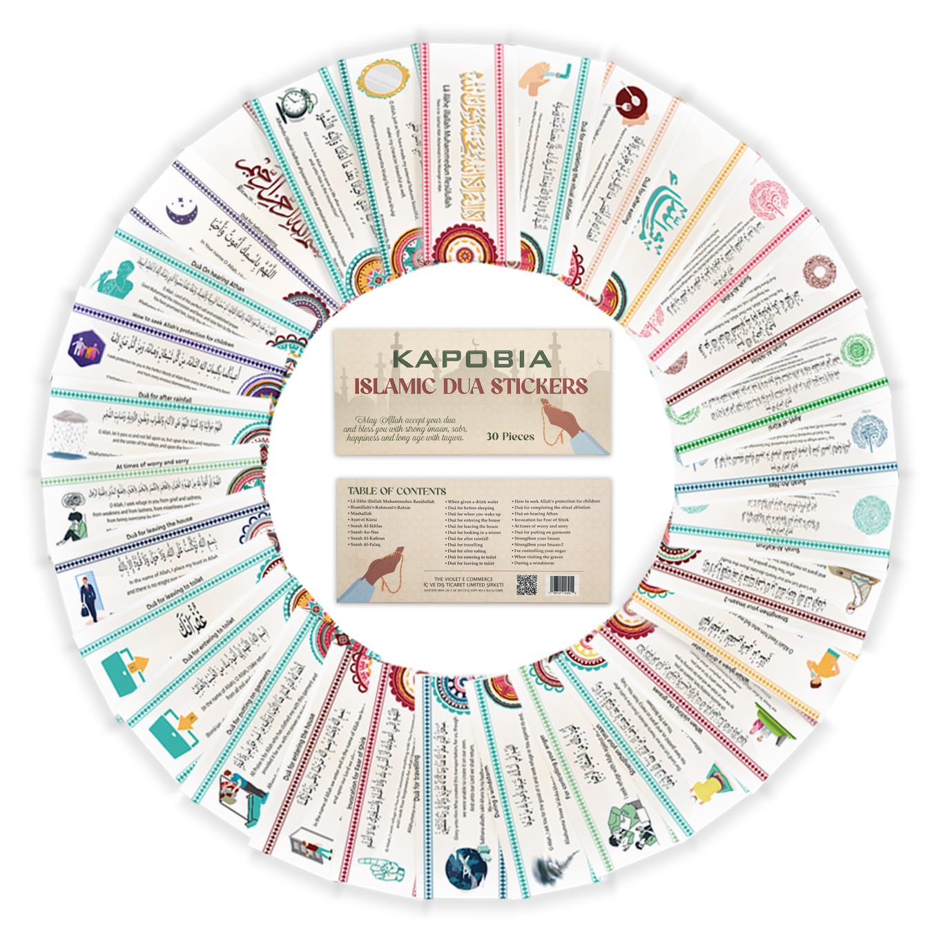 - Arabic Calligraphy Colorful Stickers: Features a variety of Quranic quotes and Islamic phrases written in Arabic script. Can also be used decoratively in personal spaces.