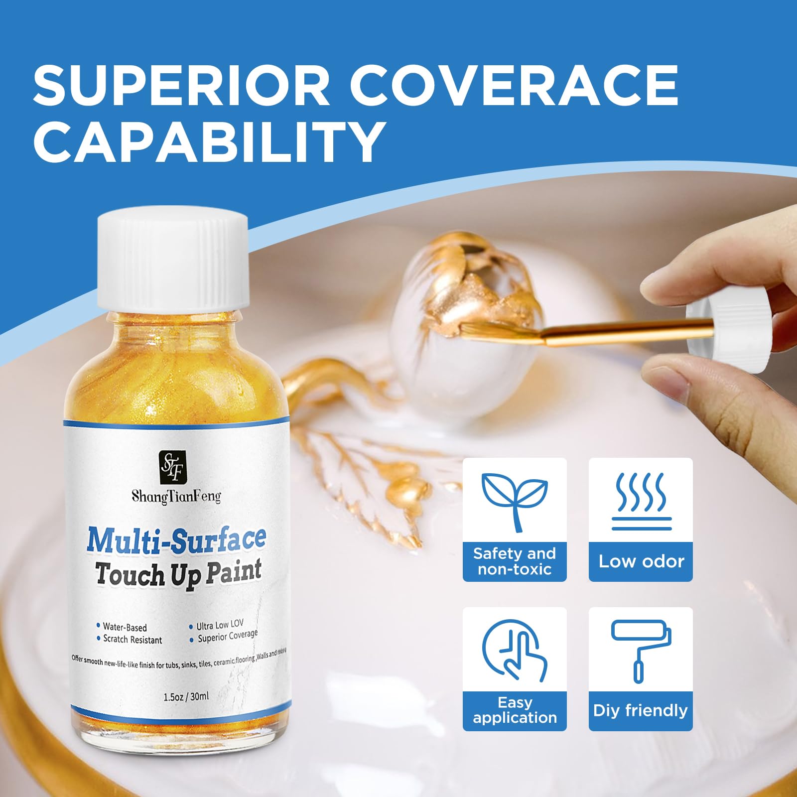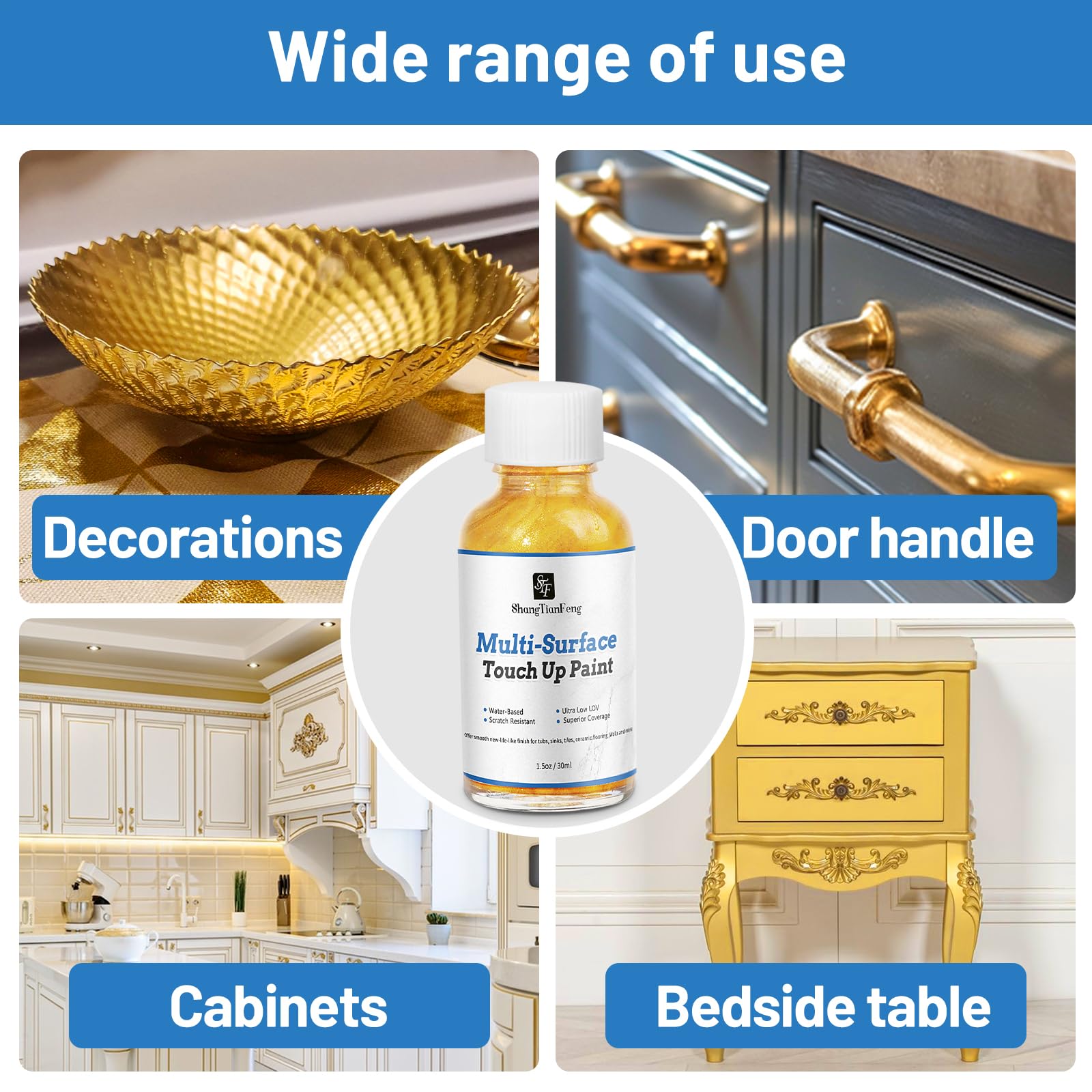 - PROFESSIONAL GOLDEN RESTORATION – Our high-gloss golden paint expertly conceals scratches and chips on appliances, tiles, and furniture, delivering a seamless finish that matches original golden surfaces. Perfect for touch-ups that look professionally done.