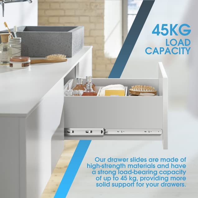 - 【100lb Load Capacity & 30 Years Service Life】—Drawer tracks 22 Inch(10 Pairs) Cold rolled Q235 steel made.The max load capacity is up to 100lb.After professional institutions testing,the open-close times reached 100000 times.