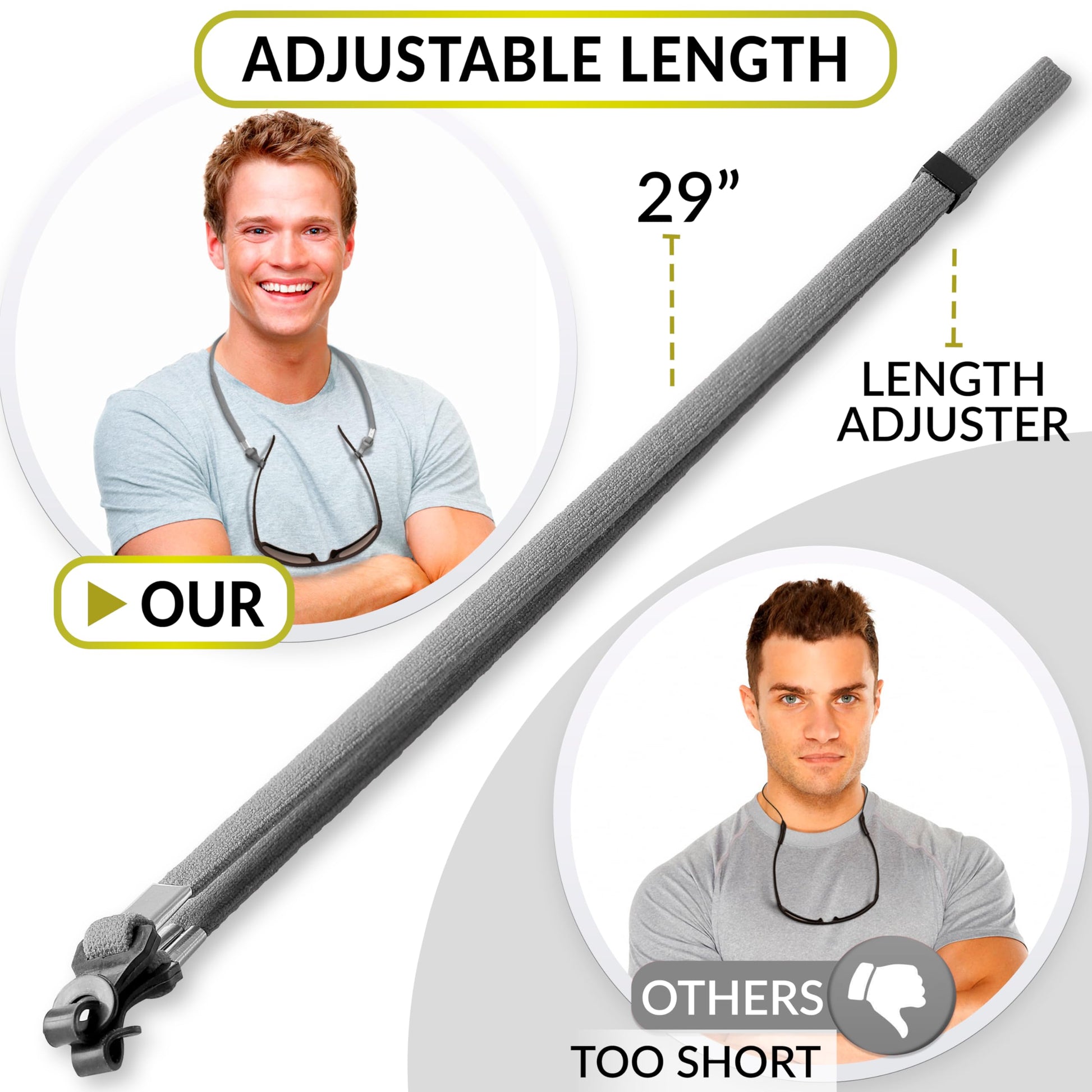- Adjust the Length - Thanks to their adjustable design and 29" length, our eyeglass straps for men & eyeglass chains for women are comfortable and versatile enough to wear for all head shapes and neck sizes.