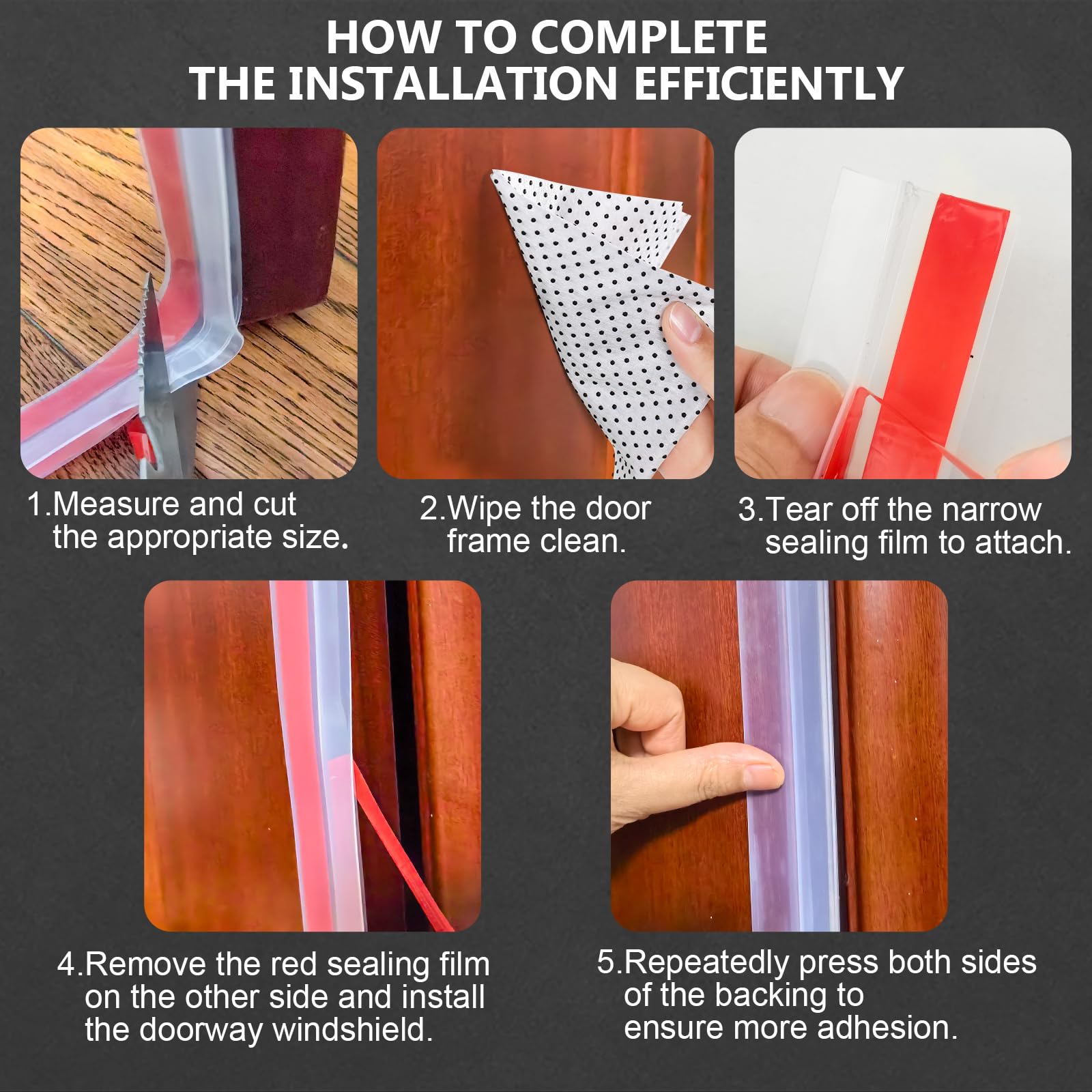 - [Installation in tens of seconds] 1.Measure the required length of the door seal strip for door frame at the side of the door and cut it.2.Wipe the dust particles on the surface of the parts that need to be pasted on the door or window to allow the adhesive strip to stick on the surface better.3.Tear off the small protective film on the side to paste the side of the door and press it firmly and repeatedly 4.Tear off the large protective film on the front to paste the front of the door and the installation can be completed.