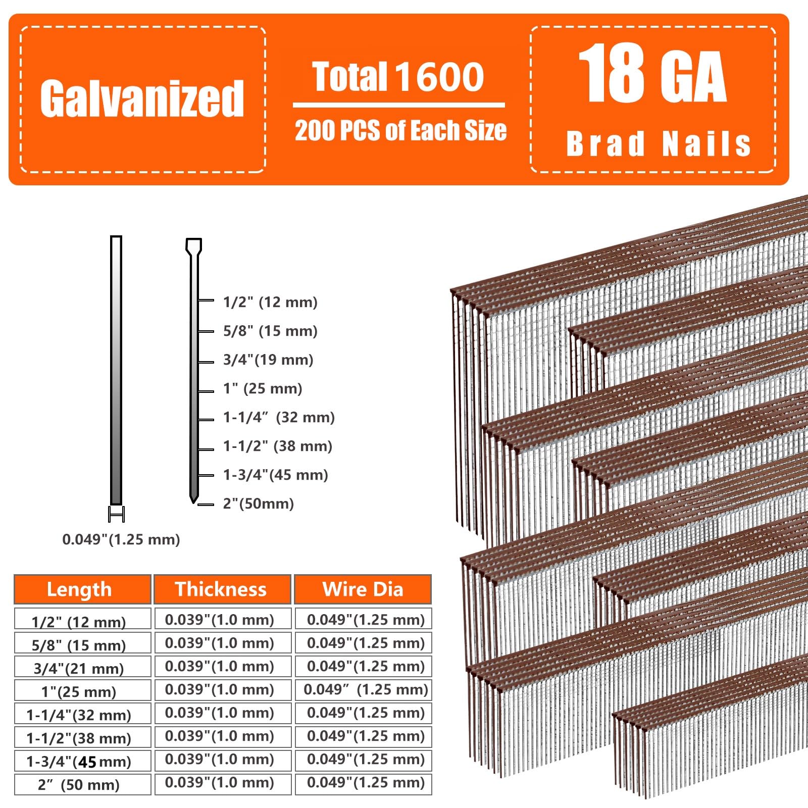 - Various sizes: The 18G brad nails has 8 different sizes, 1600 counts, including 2 inch, 1-3/4 inch, 1-1/2 inch, 1-1/4 inch, 1 inch, 3/4 inch, 5/8 inch, 1/2 inch, 200 per size, You can choose different sizes of nails according to actual needs.