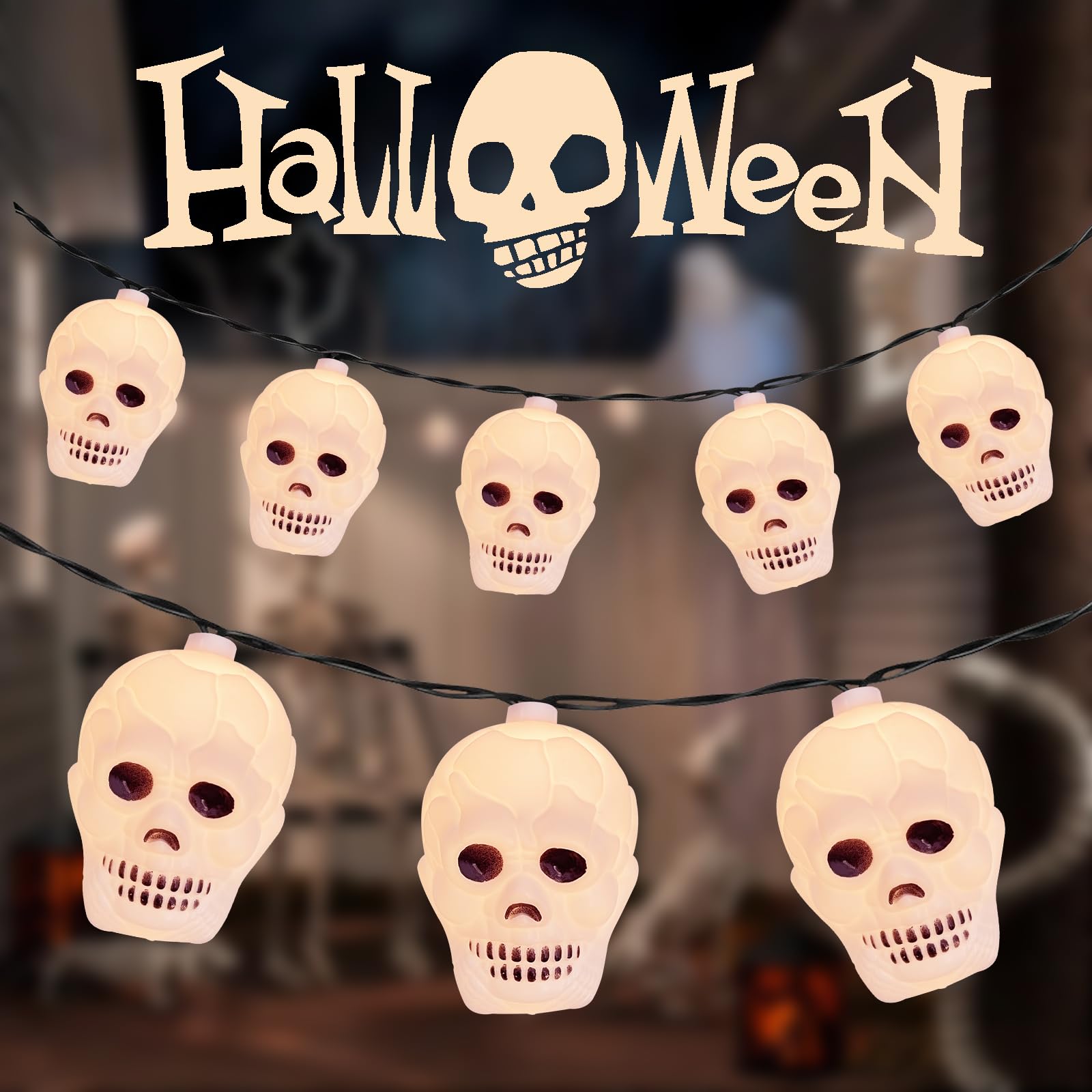 - Eerie Glow & Festive Vibe: Illuminate your Halloween with 8.5Ft outdoor halloween string lights featuring 10 LED white skull head lights. each set 0.7W, Perfect for creating a spooky ambiance in your home, yard, or party.