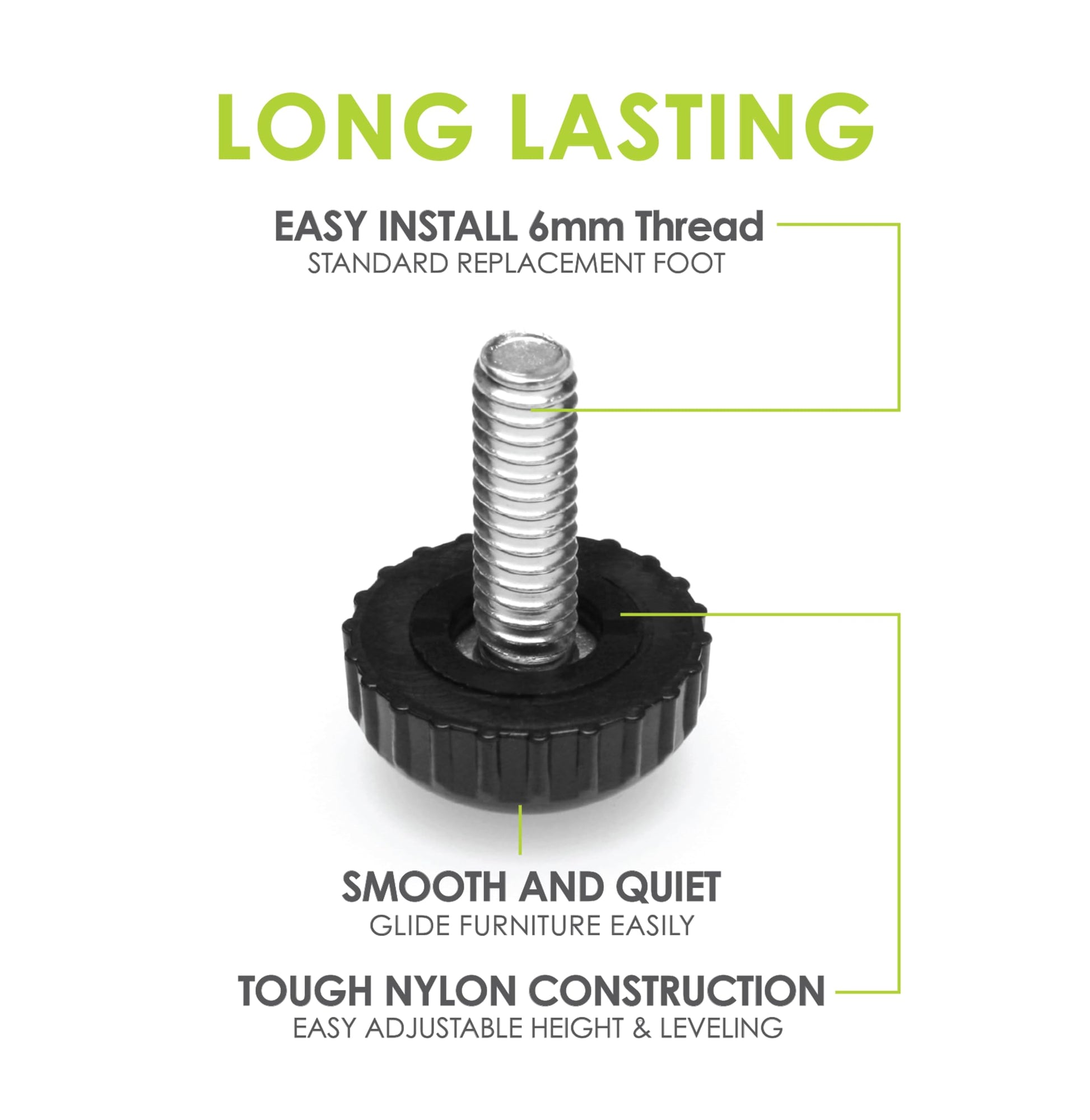 - Hard wearing nylon furniture glide leveling feet – Premium adjustable furniture leg levelers for tables, chairs, patio furniture, deck furniture, outdoor furniture, and more. Great screw in furniture sliders for outdoor and indoor use. Please measure existing furniture socket to ensure you choose the correct size and review size / fit information images.