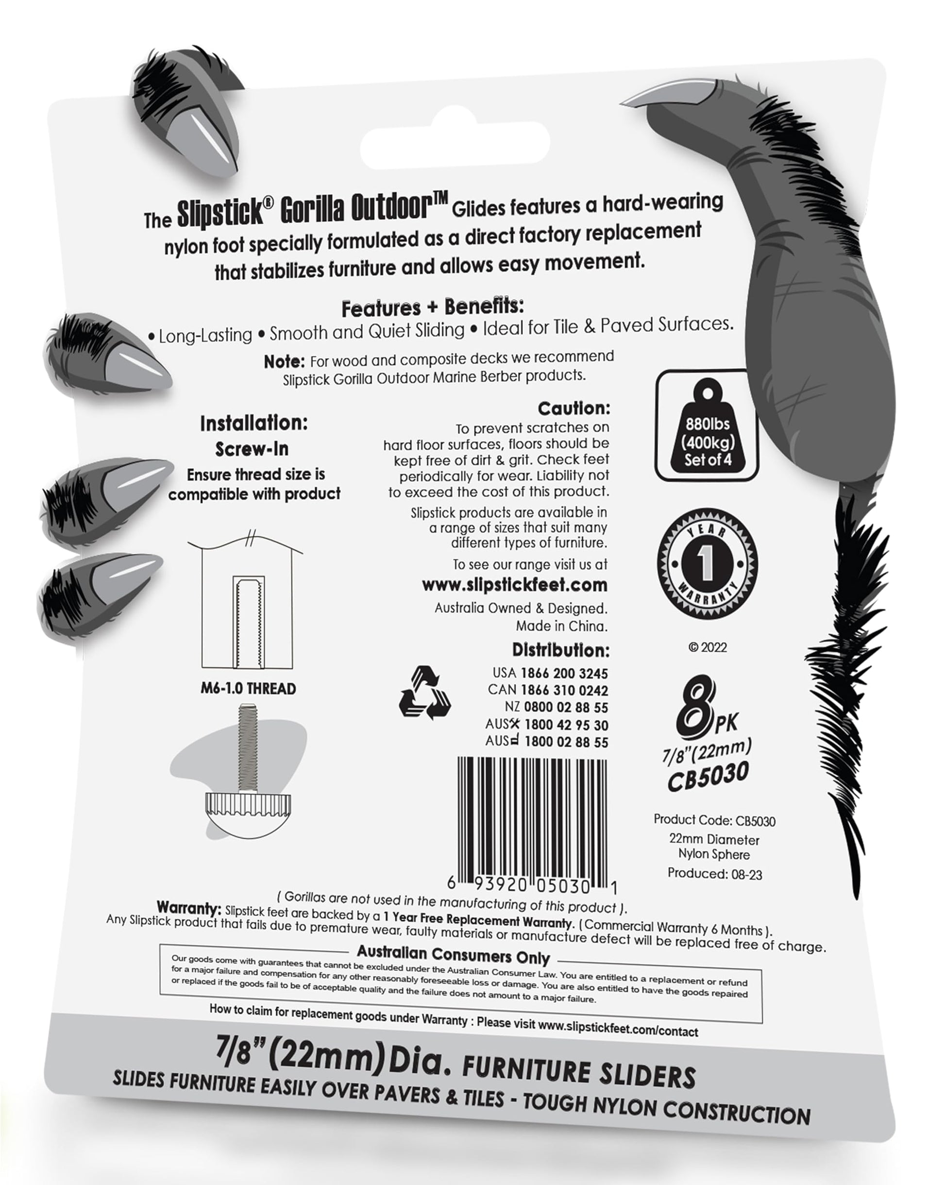 Slipstick Gorilla Outdoor Adjustable Furniture Levelers (8 Pack) Weatherproof Screw in Leg Glides for Chairs, Tables, and Outdoor Furniture Feet, 7/8 Inch Nylon Spherical Glide, M6 Thread