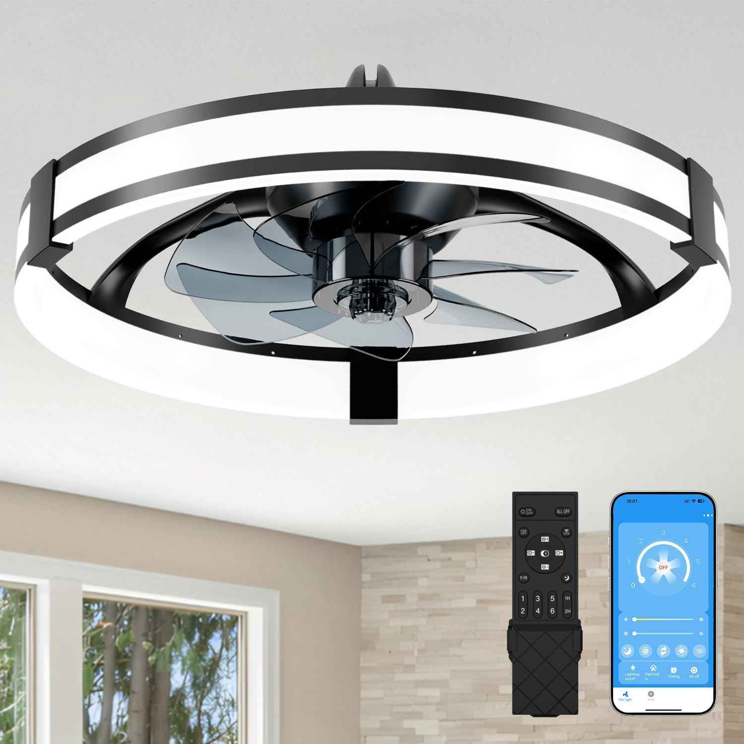 Smart Bladeless LED Ceiling Fan with Lights & Remote - 20" Black Low Profile Flush Mount for Bedroom