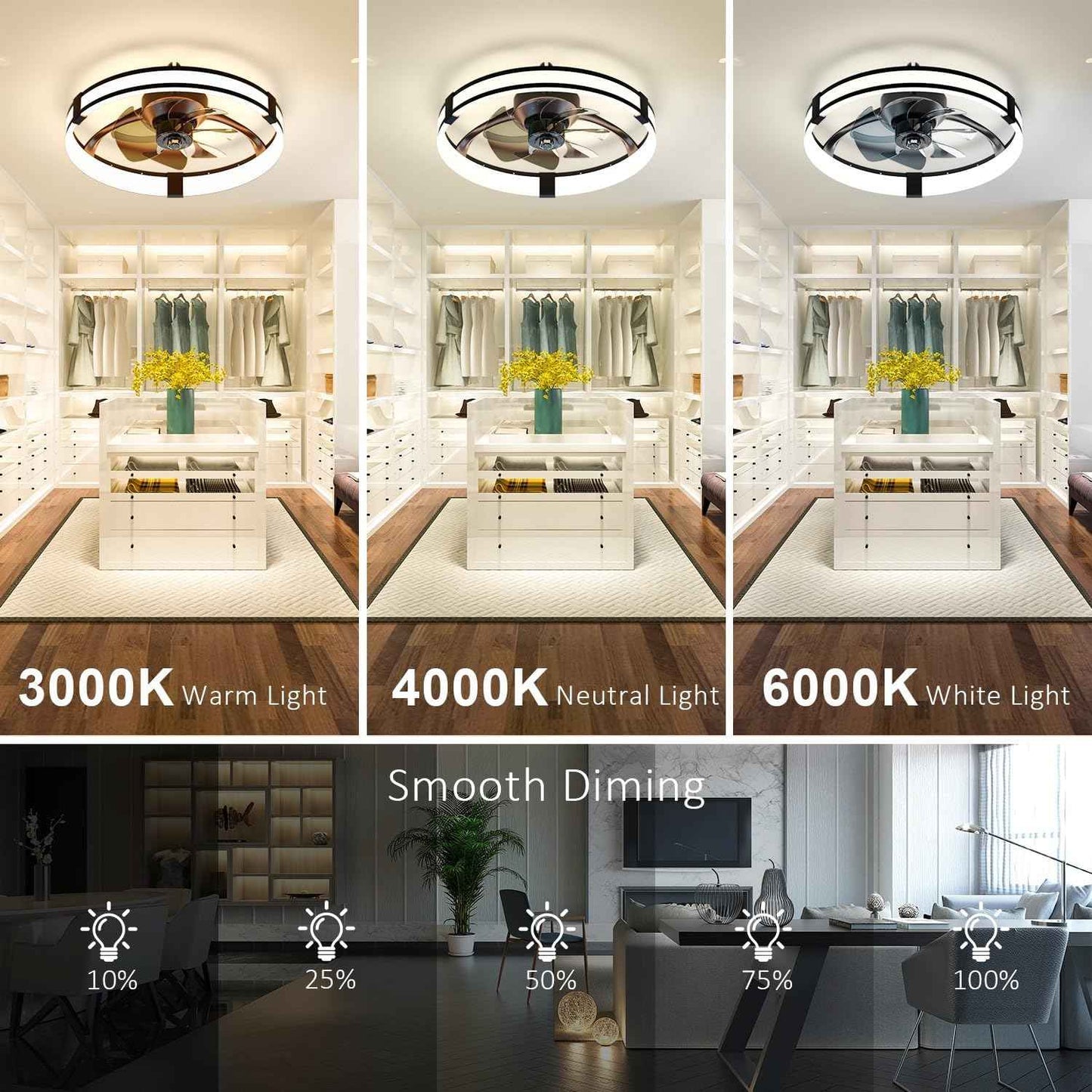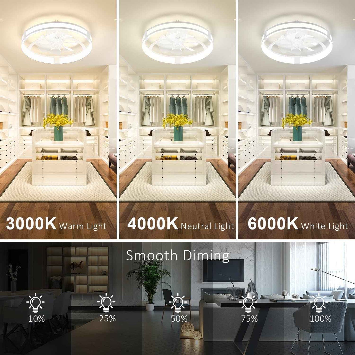 - 【Smart & Dimmable Light】Aipsun ceiling fans with lights offers smart and dimmable features, allowing you to conveniently adjust the brightness and customize the color temperature via both the remote control and the APP. Whether you require warm (3000K) or bright light (6500K) to create your desired ambiance.Recommended for rooms sized between 15-25 m², it ensures optimal airflow and lighting coverage for a comfortable environment.