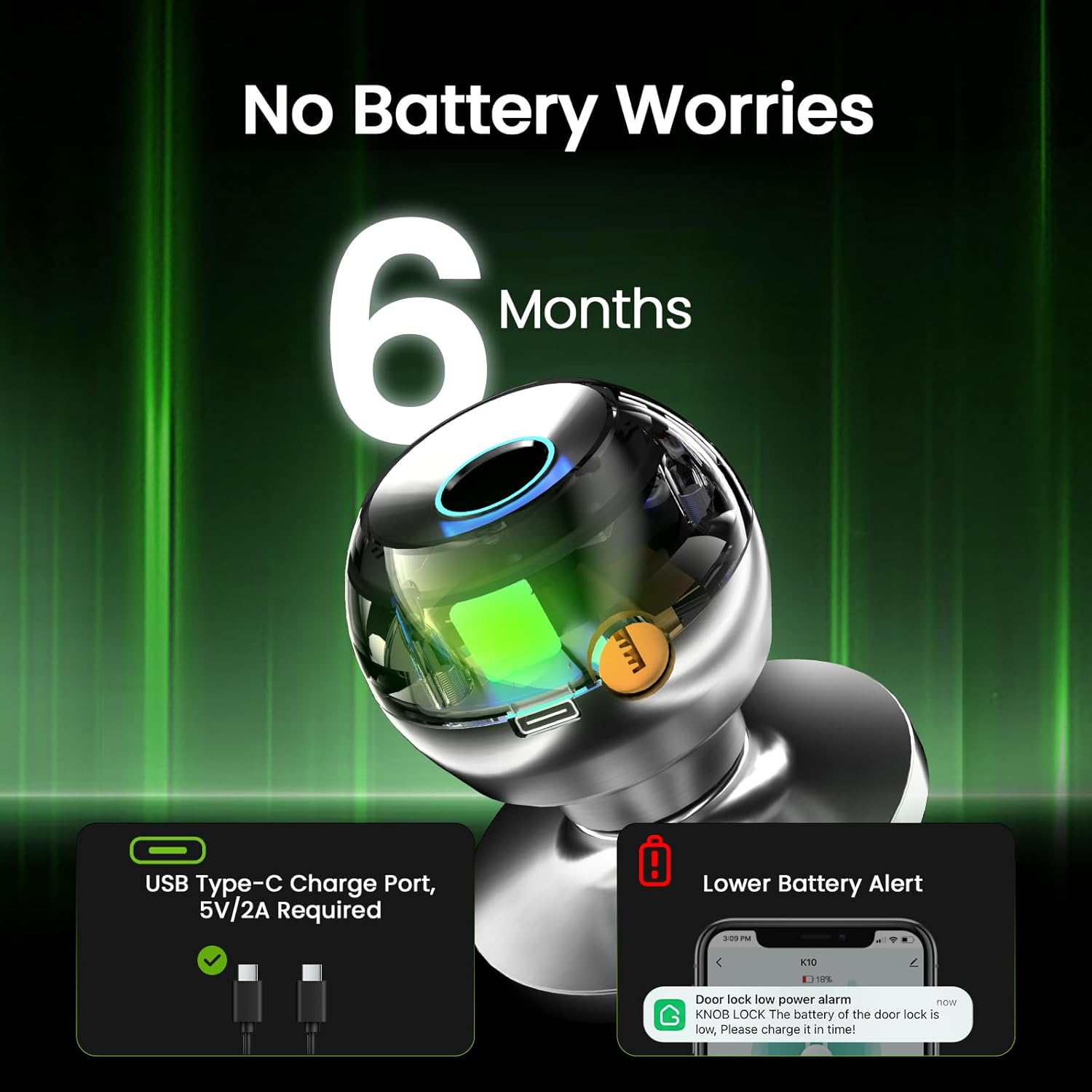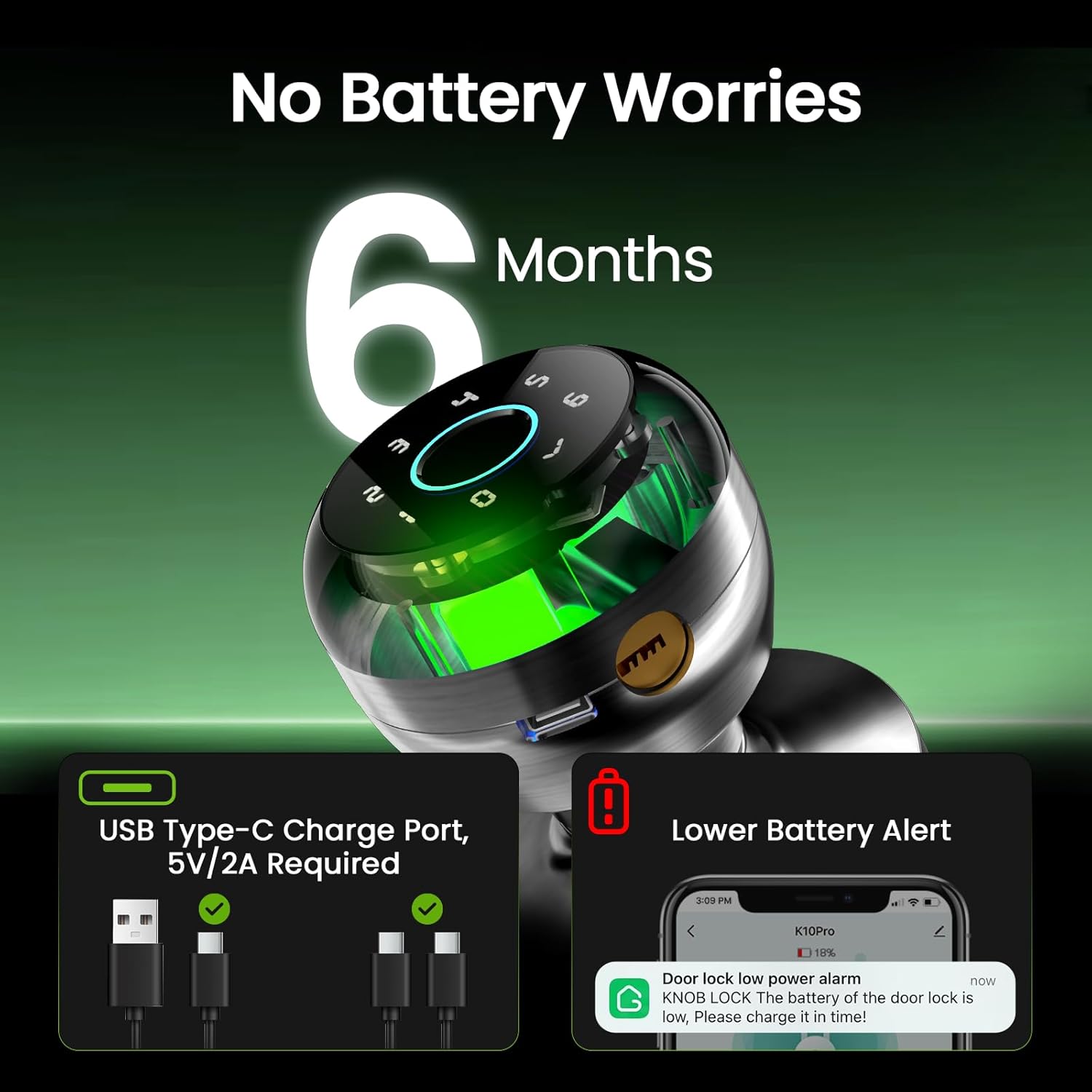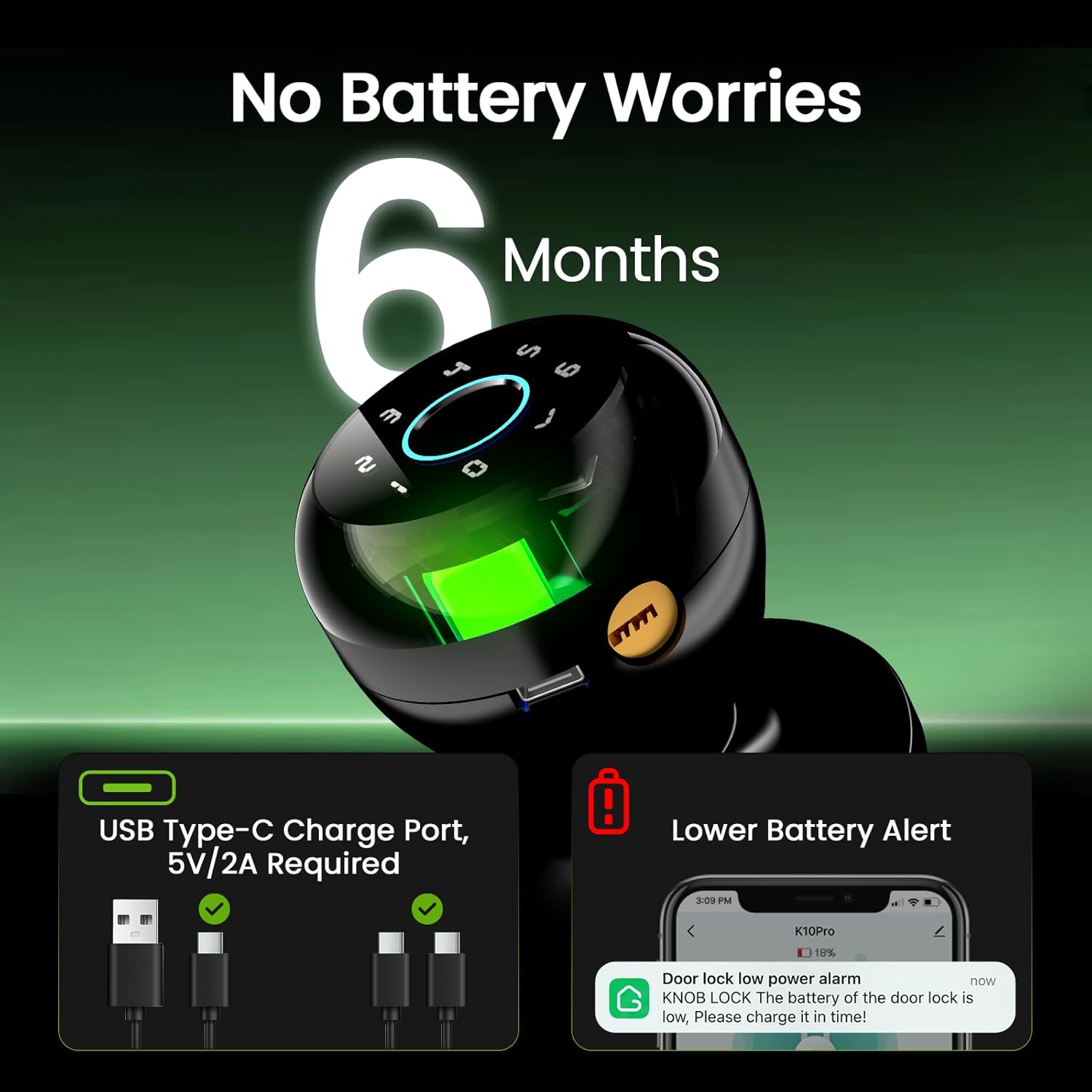 - 【Long-Lasting Battery & Easy Installation】The door knob with lock features a 400mAh rechargeable battery that fully charges in 3-6 hours and lasts up to 6 months. ( The fingerprint door knob has a low battery indication in App.) Easy to install with a screwdriver and fits most US doors. Please check the dimensions before purchasing.