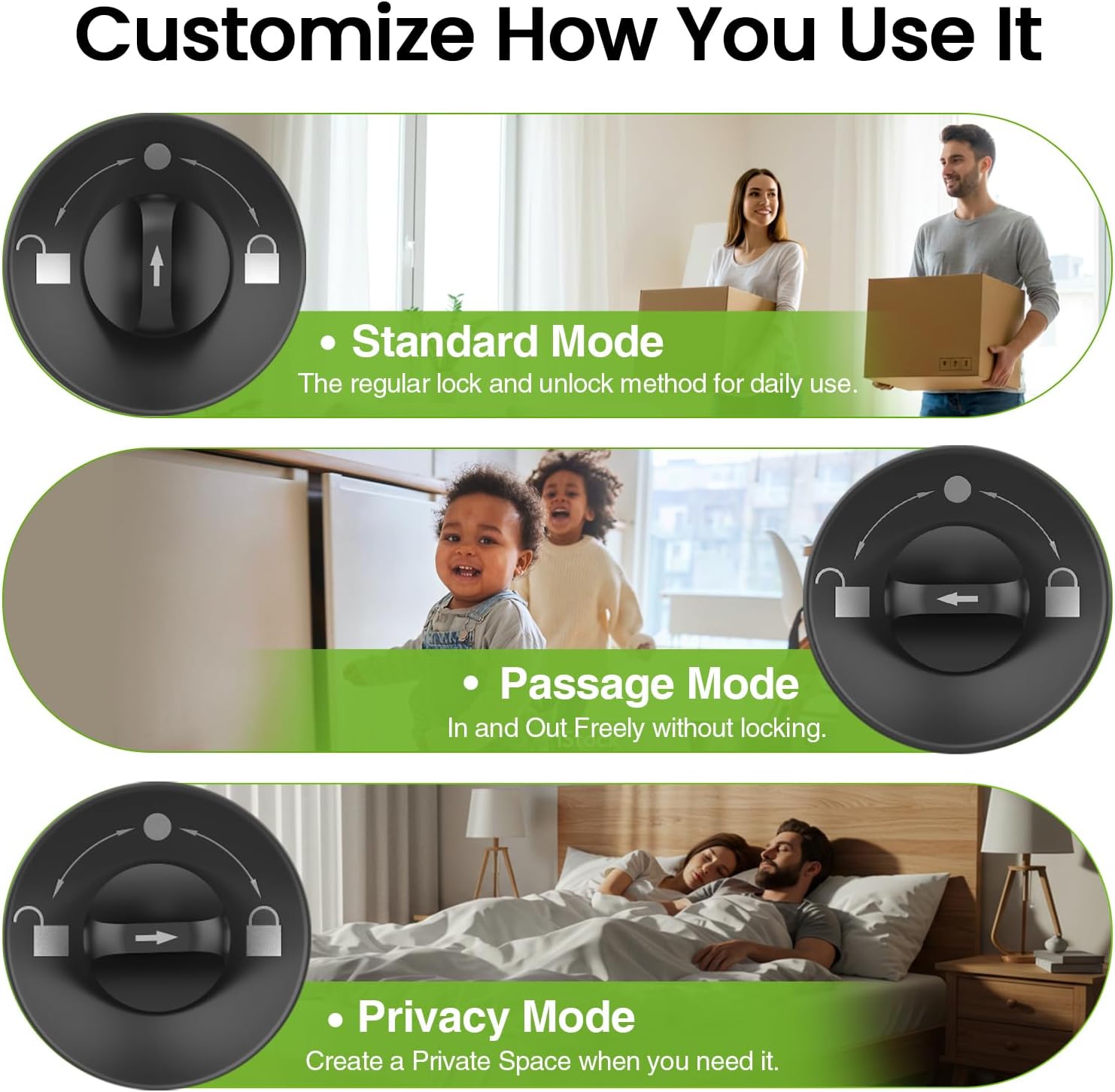 - 【Smart App Integration & Mode Switching】Manage fingerprints, view unlock logs, and set auto-lock, passage, and privacy modes via the App. The electrical door lock supports passage, normal, and privacy modes, which can be easily switched by rotating the fingerprint area. Note: App control requires Bluetooth.
