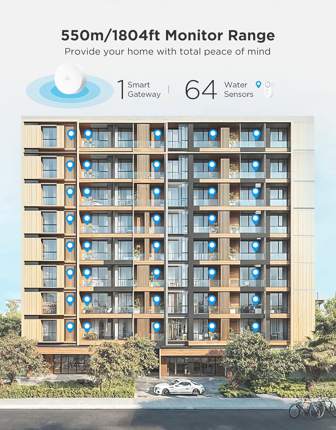 - Breakthrough 550m/1804ft Connectivity: Engineered with advanced Sub-1G long-range wireless tech, our leak detector maintains robust signals over unprecedented distances—reaching up to 550 meters (1804 feet) even through 5 dense walls. Secure every critical space in expansive properties, from deep basements to detached garages and distant outbuildings.