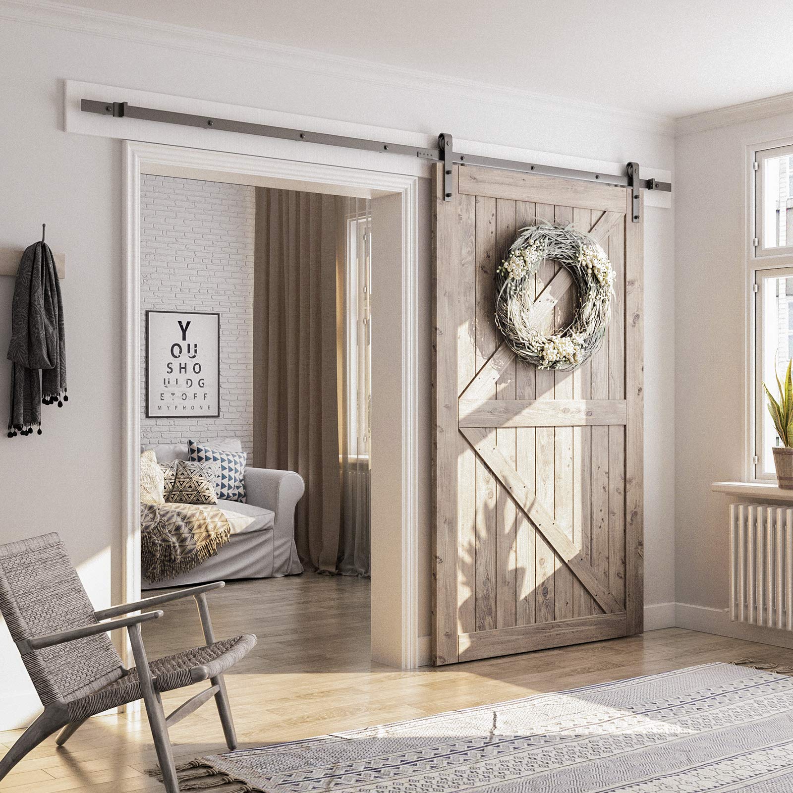 - 【THE BEST CHOICE FOR YOUR HOUSE】This modern twist on the classic barn door not only saves space, it allows the ability to open up multiple rooms without the annoyance of a swinging door.