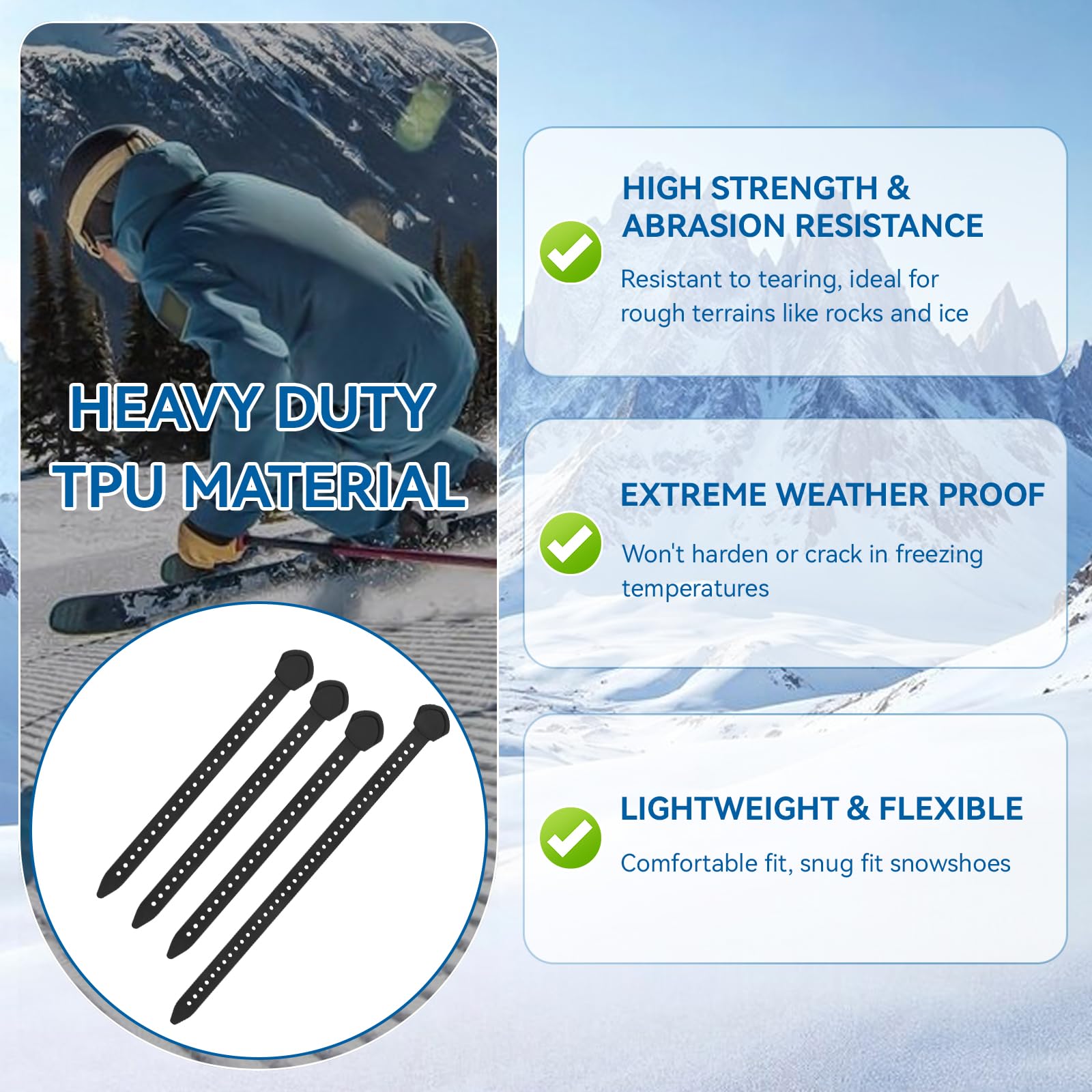 - HEAVY-DUTY TPU CONSTRUCTION: Made from high-performance thermoplastic polyurethane (TPU), these straps replacement for msr snow shoe straps stay flexible in subzero temperatures, resist cracking, and endure harsh ice and snow abrasion, ensuring long-lasting reliability.