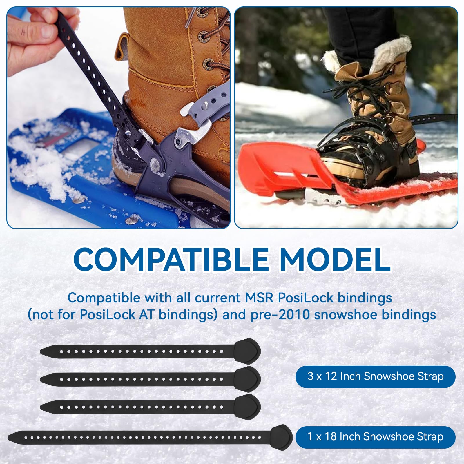 - SNOWSHOE STRAPS FOR MSR SNOWSHOES: These snowshoe replacement straps for fastening over the shoe (front), compatible with MSR Evo Ascent Snowshoes, fit for all current MSR PosiLock bindings (except PosiLock AT models) and pre-2010 snowshoe bindings. Perfect for replacing worn or cracked straps on older snowshoes.