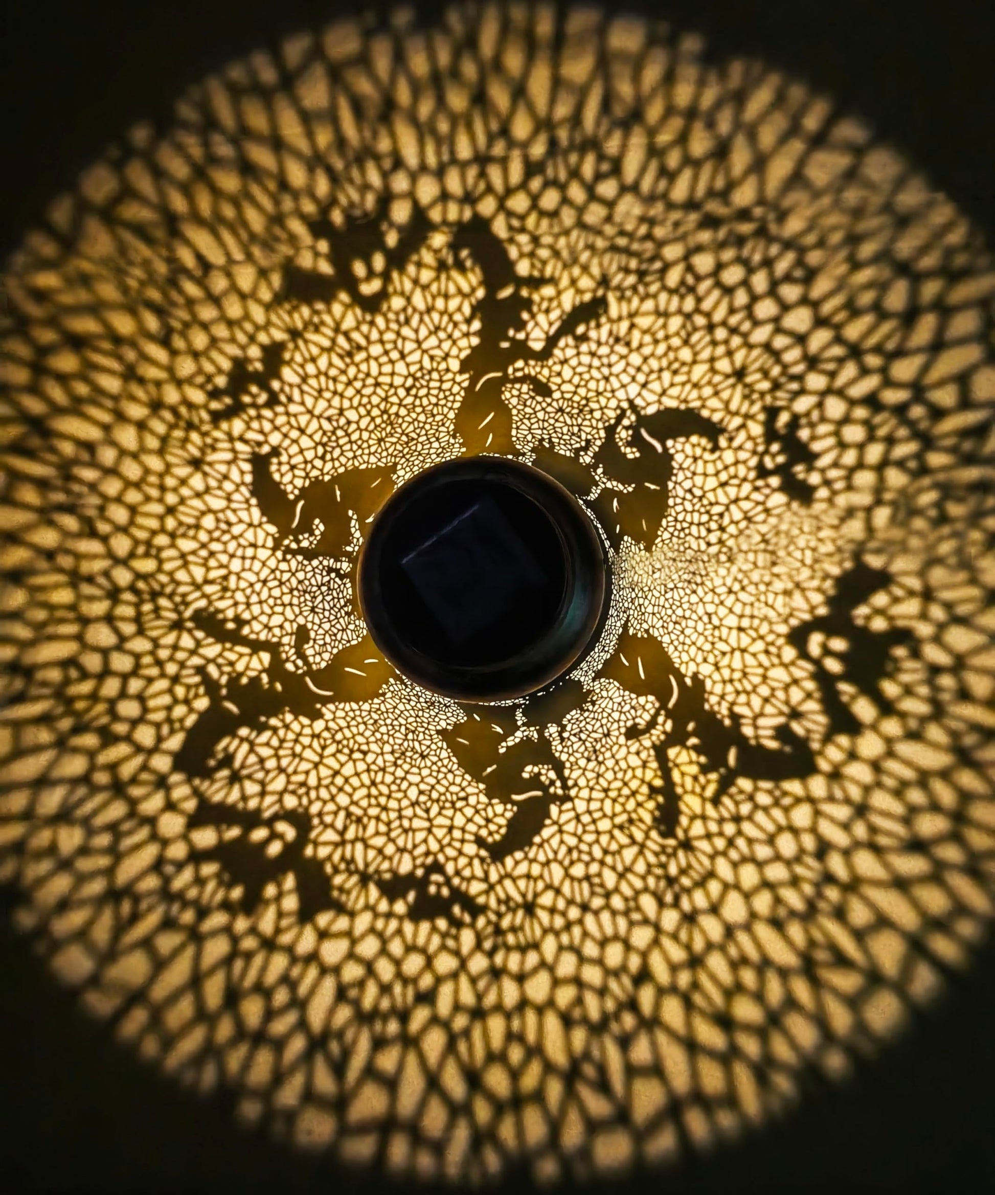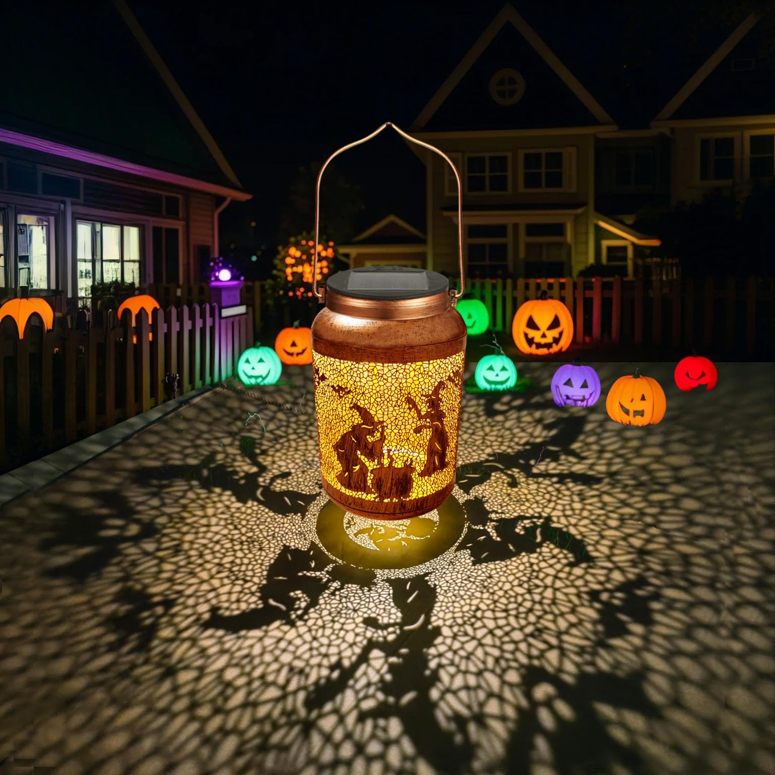 - Unique Halloween Decoration: The retro appearance, with gold copper color and hollow out metal veneer, the solar outdoor lanterns casts bright and warm light in darkness, casting light and shadow on the ground, such as witch, bats. The whole scene is vivid and interesting, with a strong sense of Halloween decoration, adding a strong atmosphere to Halloween.