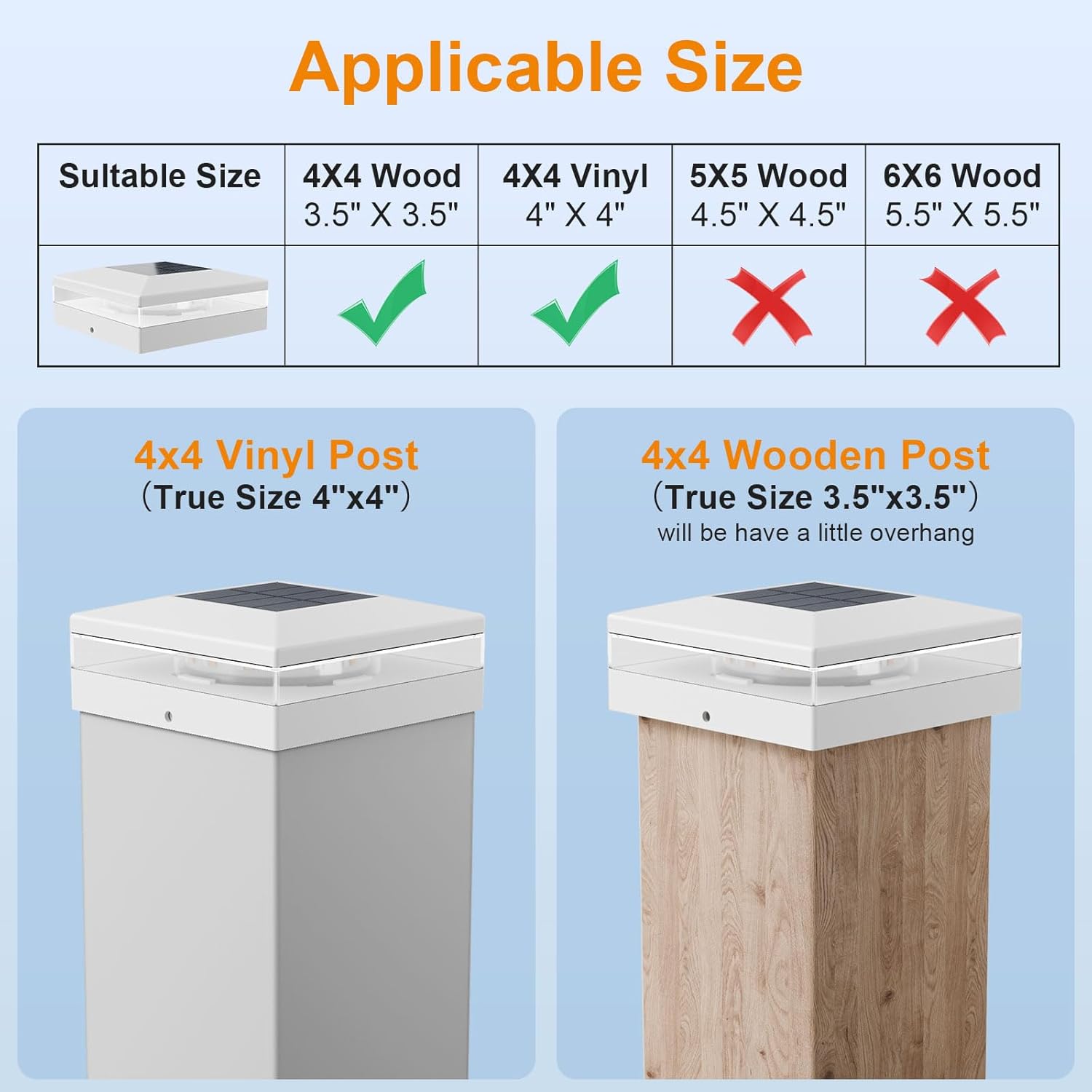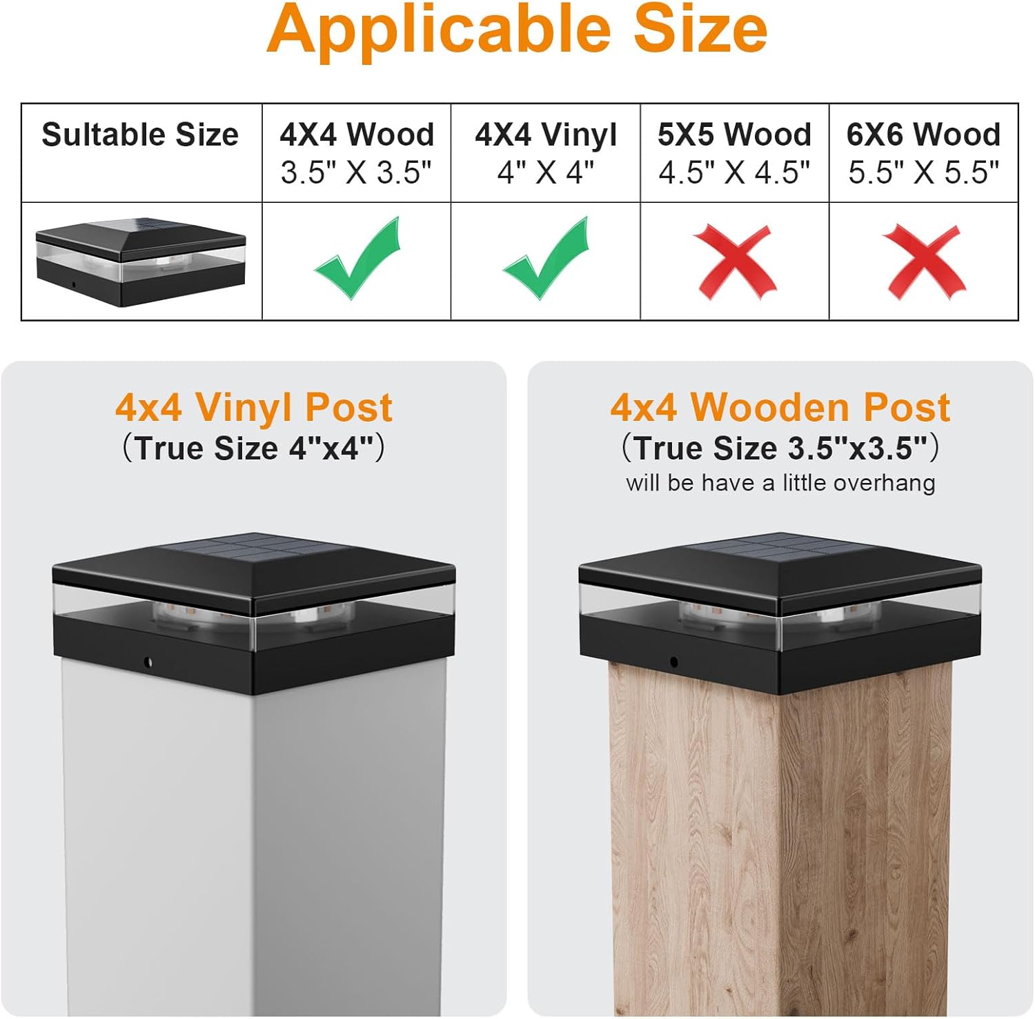 - 【Easy to Install】Our solar post functional base fits 4x4 inch wooden posts and 4x4 inch vinyl posts. Simply screw the solar cap lights into highest point on the railing, and choose the light mode you want. Please refer to the installation instructions on the pictures.