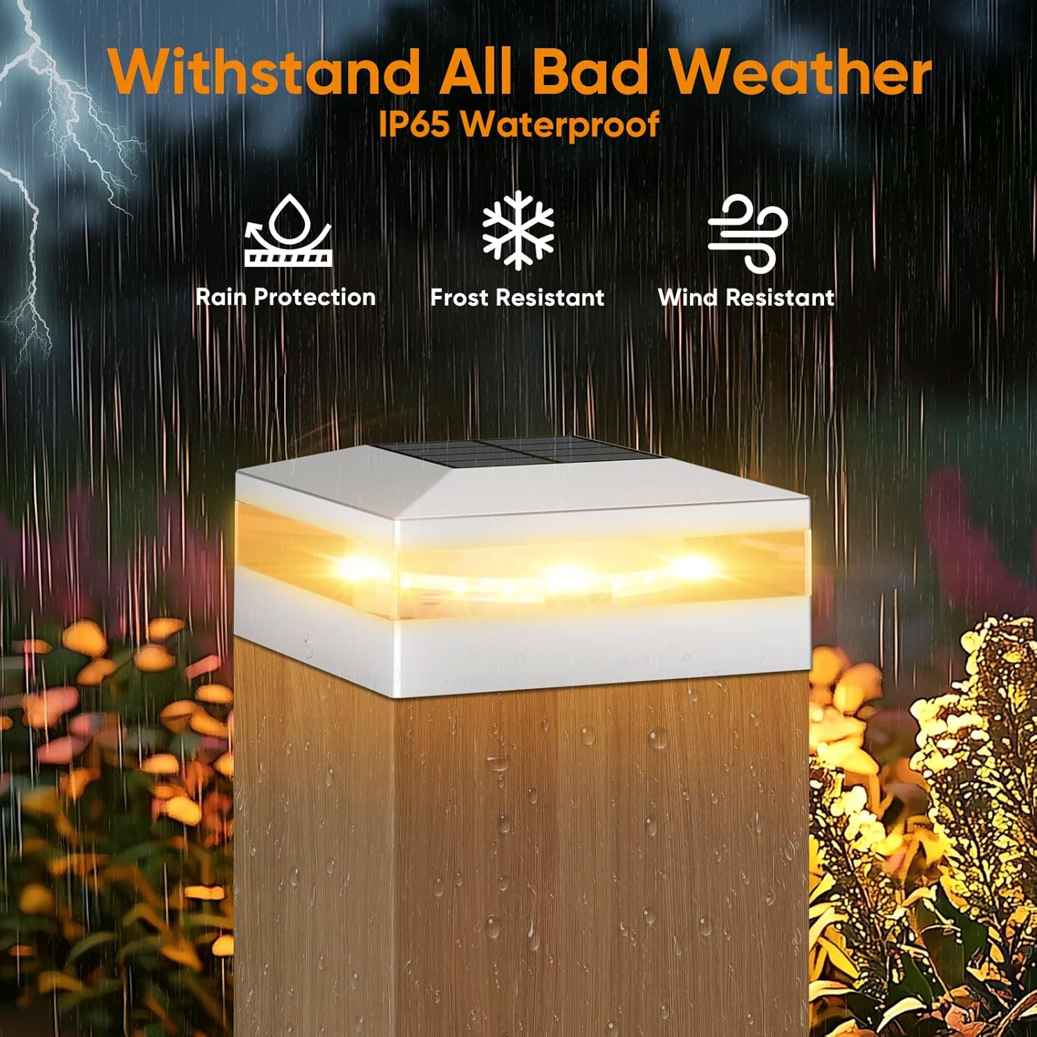 - 【IP65 Waterproof & Weather Resistant】The deck post lights solar powered can work normally in all kinds of bad weather with the waterproof rating of IP65. Made of corrosion-resistant ABS material, it will withstand high temperature, rain, wind and snow. You can place them in the front, backyard, walkway, sidewalk, around your patio or porch, perfect for your outdoor decoration.
