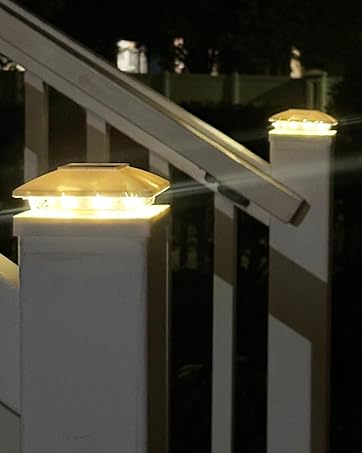 - [TWO COLOR MODES] Solar cap for deck post has two modes of light color, warm white/cool white, both are very bright.The appearance is matched with modern lines, showing a modern style.The decorative clear casing lines are a great complement to all different styles of Vinyl fence posts/Fence/backyard/dock/deck/a patio area
