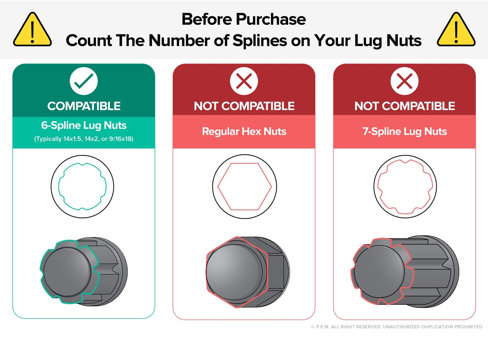- NOT compatible with smaller spline lug nuts (M12 or 1/2"). Also NOT compatible with spike lugnuts.