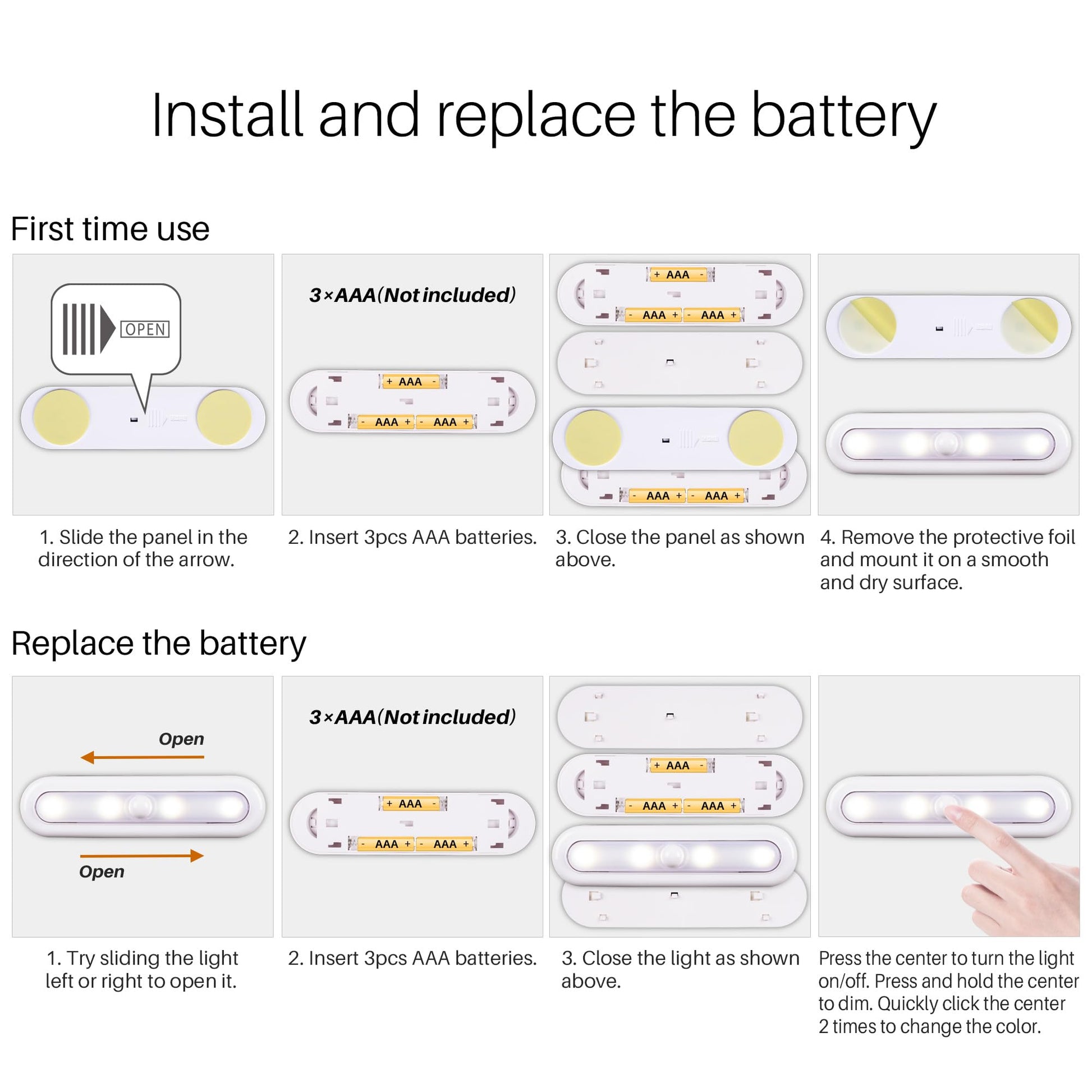 - Battery Operated: Each stick on light is powered by 3 AAA batteries (not included). Wireless lighting, uncomplicated and safe, no worries about the risk of electric shock to children