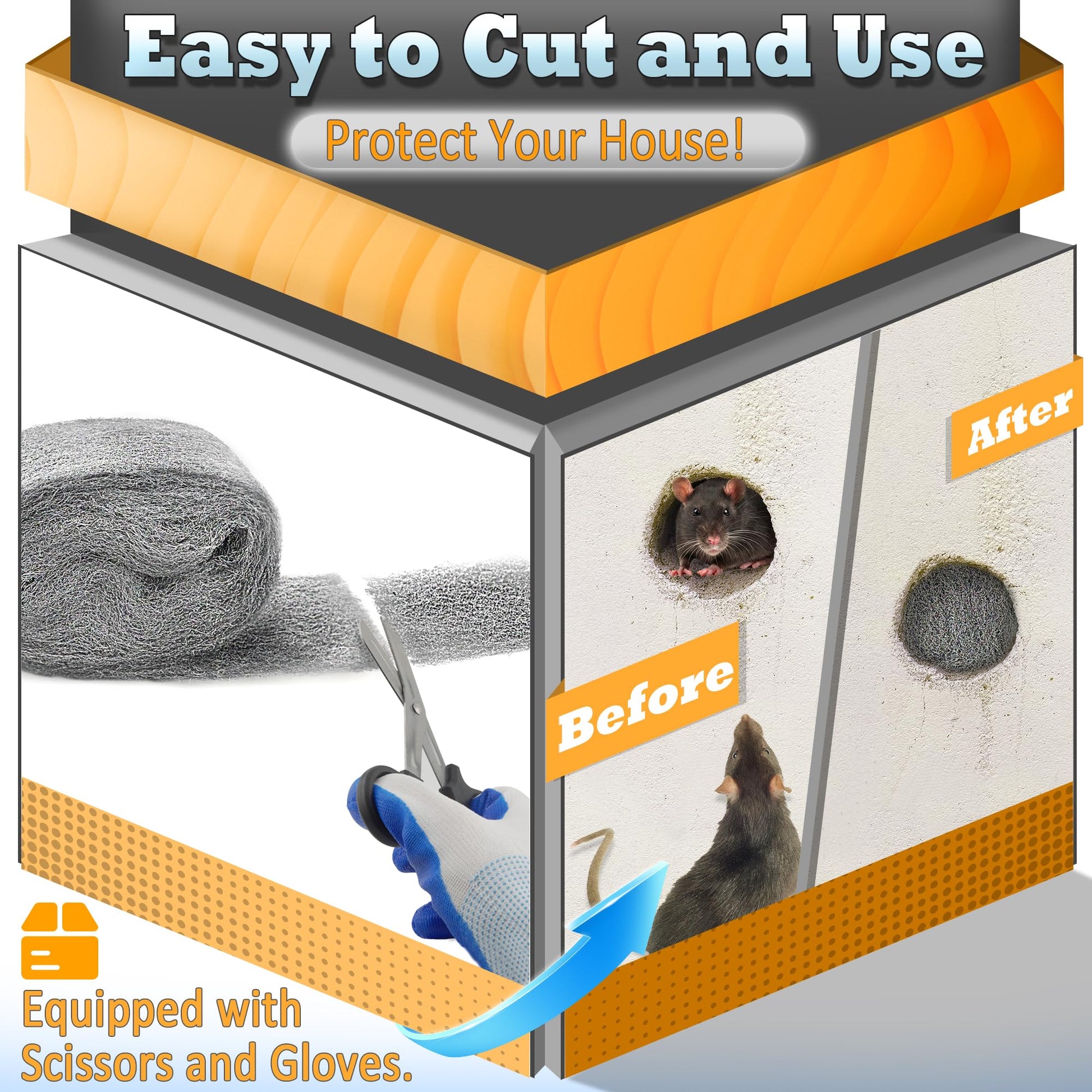 - Easy and Flexible to Use Steel Wool: The steel wool roll is highly flexible and bendable. You can effortlessly cut and shape it to fit any hole, including those with uneven or curved surfaces. Simply cut the steel wool to the desired size with scissors and fill the gaps. Always wear the provided gloves when cutting to avoid potential cuts from the material.