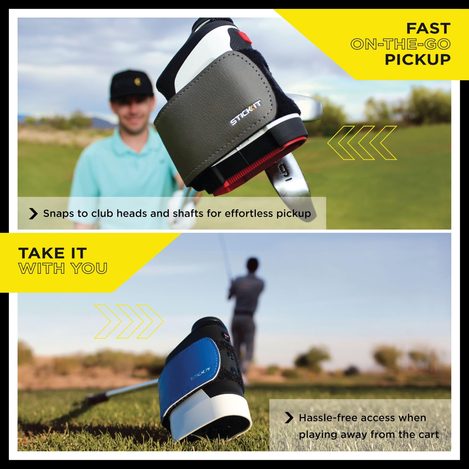 - ALWAYS IN REACH FOR WALKERS & RIDERS — STICKIT is the solution for what to do with your rangefinder between shots, for walkers and riders, sticking to carts, clubheads, and the STICKIT Metal Golf Bag Clip. Get grab-n-go access and a quick pick-up from the turf when shooting yardages away from the cart. Just grab it, shoot it and STICK IT!