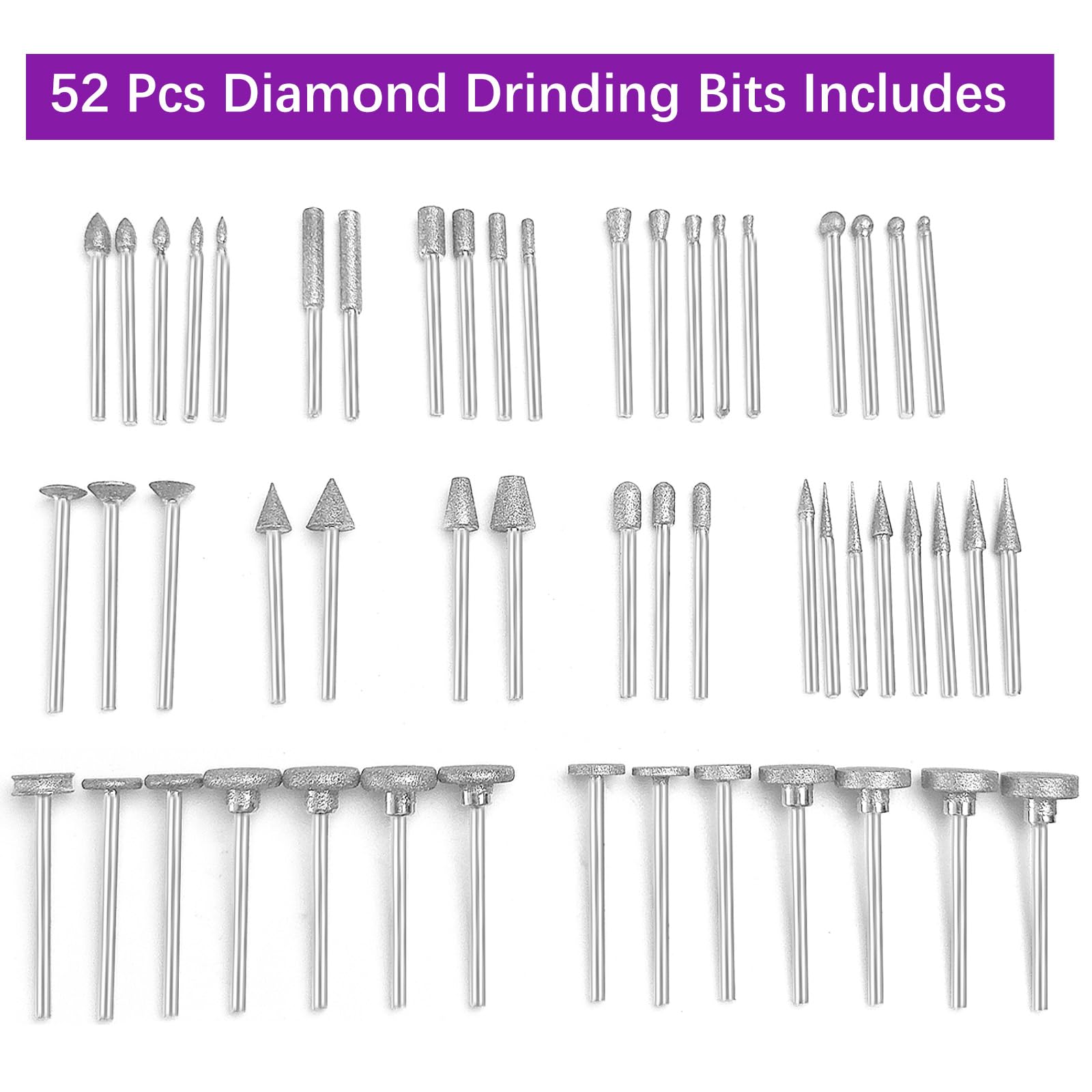 - Specification: Diamond grinding bit *52pcs, clear plastic box *1. Note: The blue tray in the first picture is for the product display support stand, and is not included in the package content