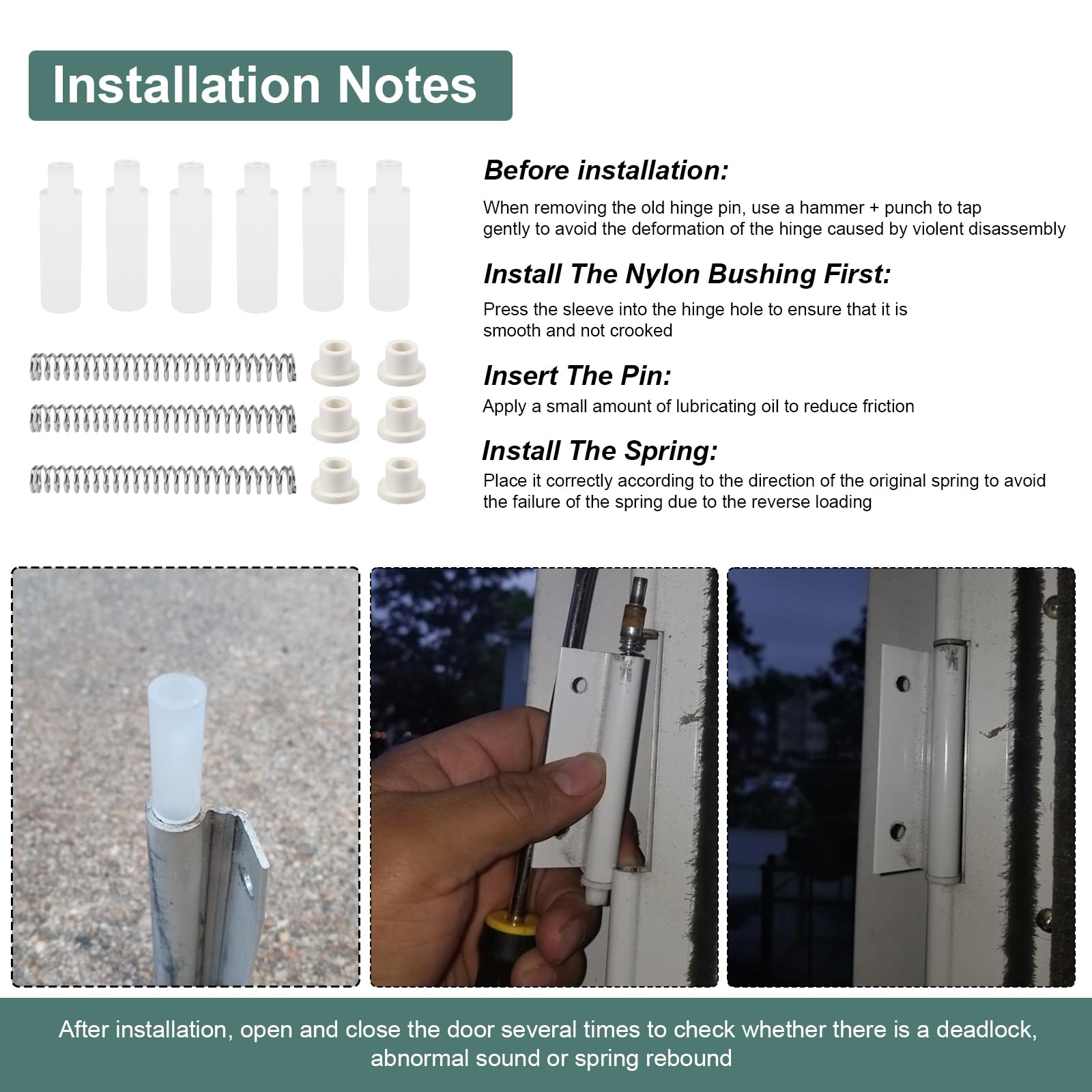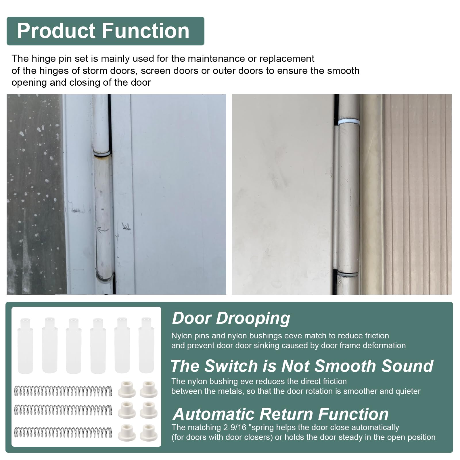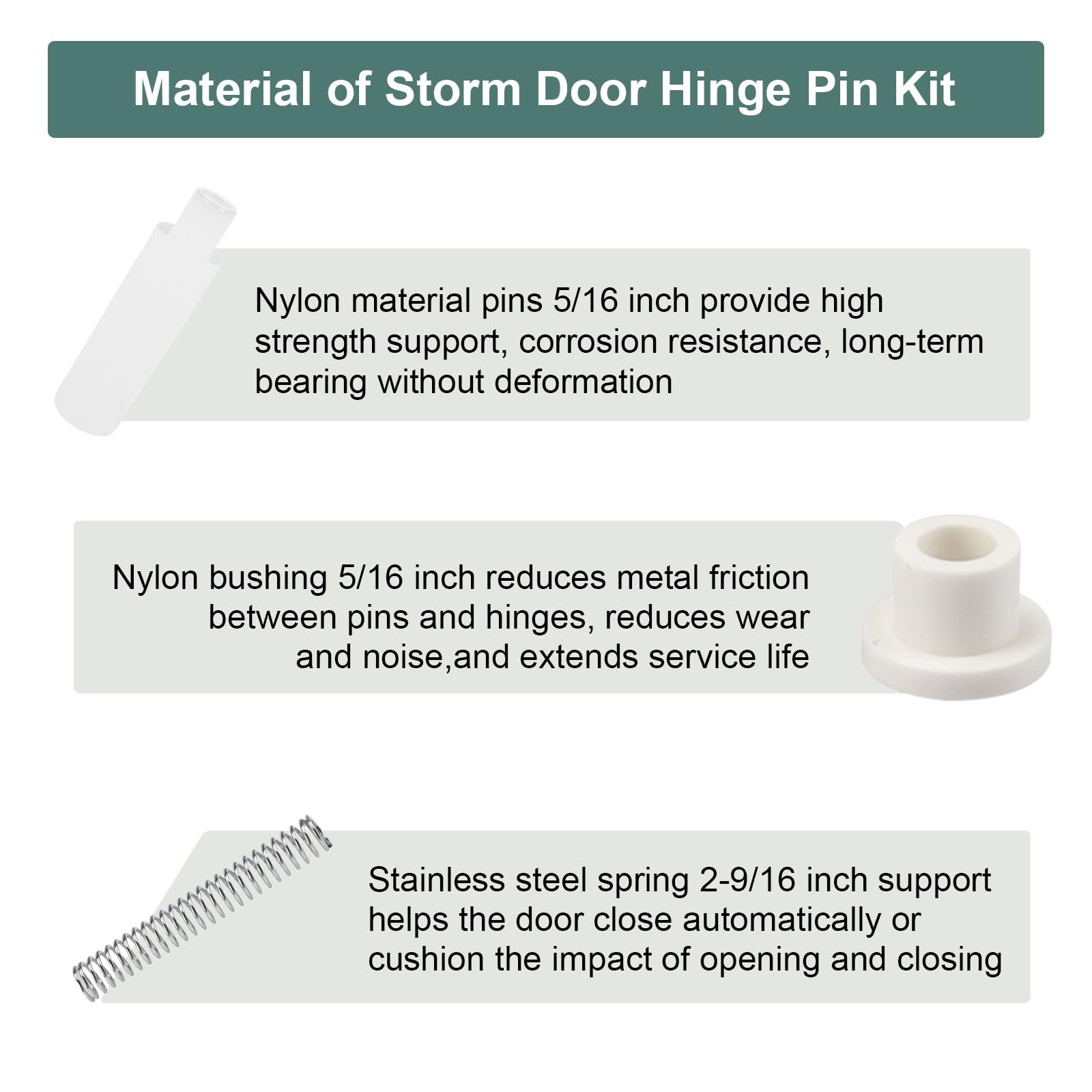 - √ Storm Door Hinge Pin Repair Kit: Including 3 pcs 2-9/16 inch steel springs, 6 pcs 5/16 inch nylon pins, 6 pcs 5/16 inch nylon bushings