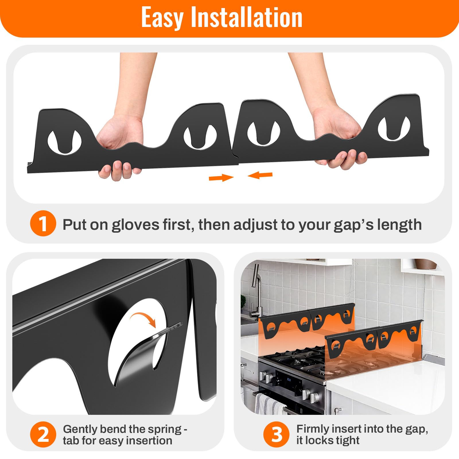 - Easy to Install : No tools or hassle needed. Simply expand the stove gap filler, press into place, and it locks securely. The spring-loaded design holds firm during daily cleaning