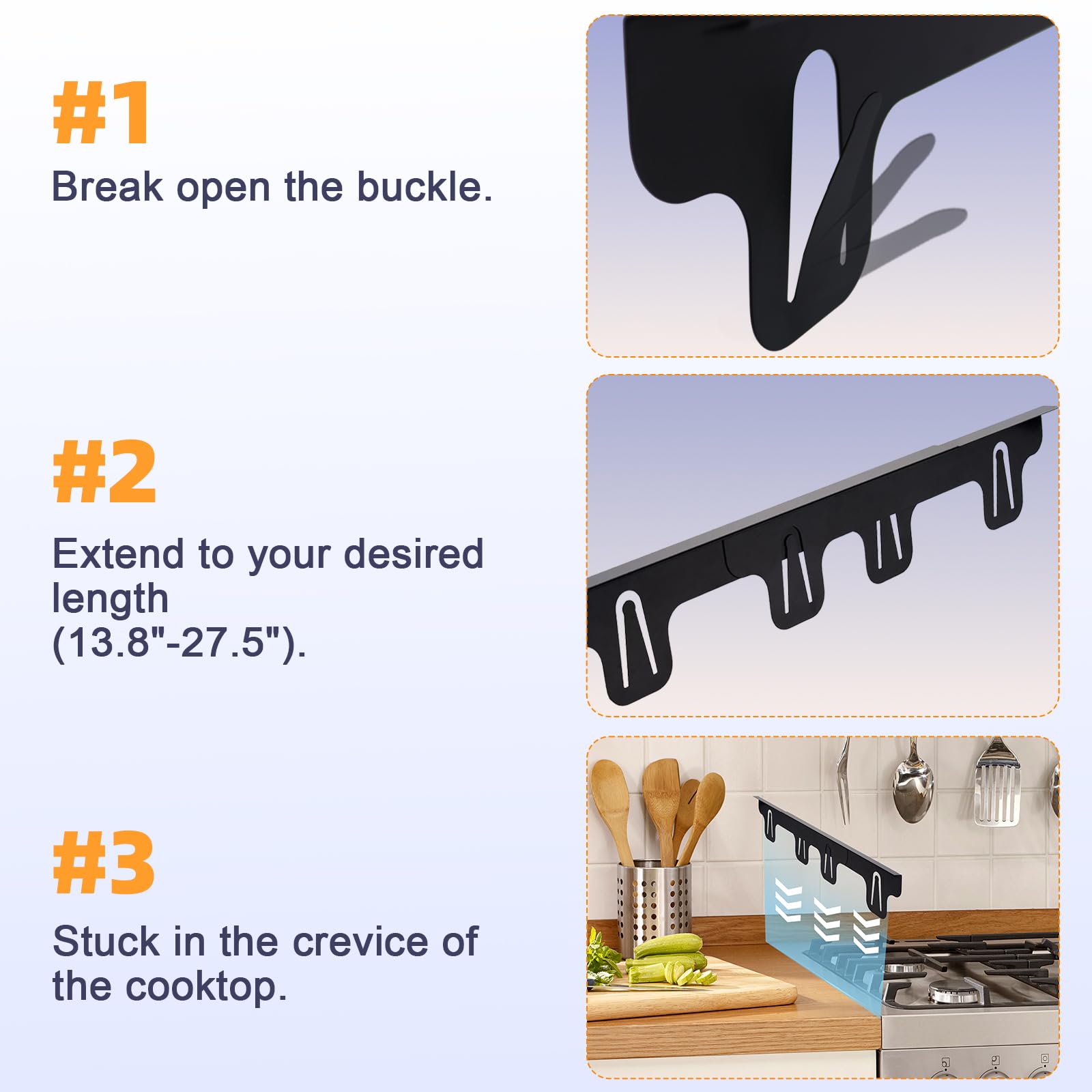 - 【Universal Fit & Adjustable Length】To ensure a perfect fit, please measure your gap before ordering. This cover's length is adjustable (13.8" to 27.5"), and its L-shaped design accommodates height differences between the stove and countertop. It seamlessly fits most kitchen setups but is not suitable for uneven surfaces.