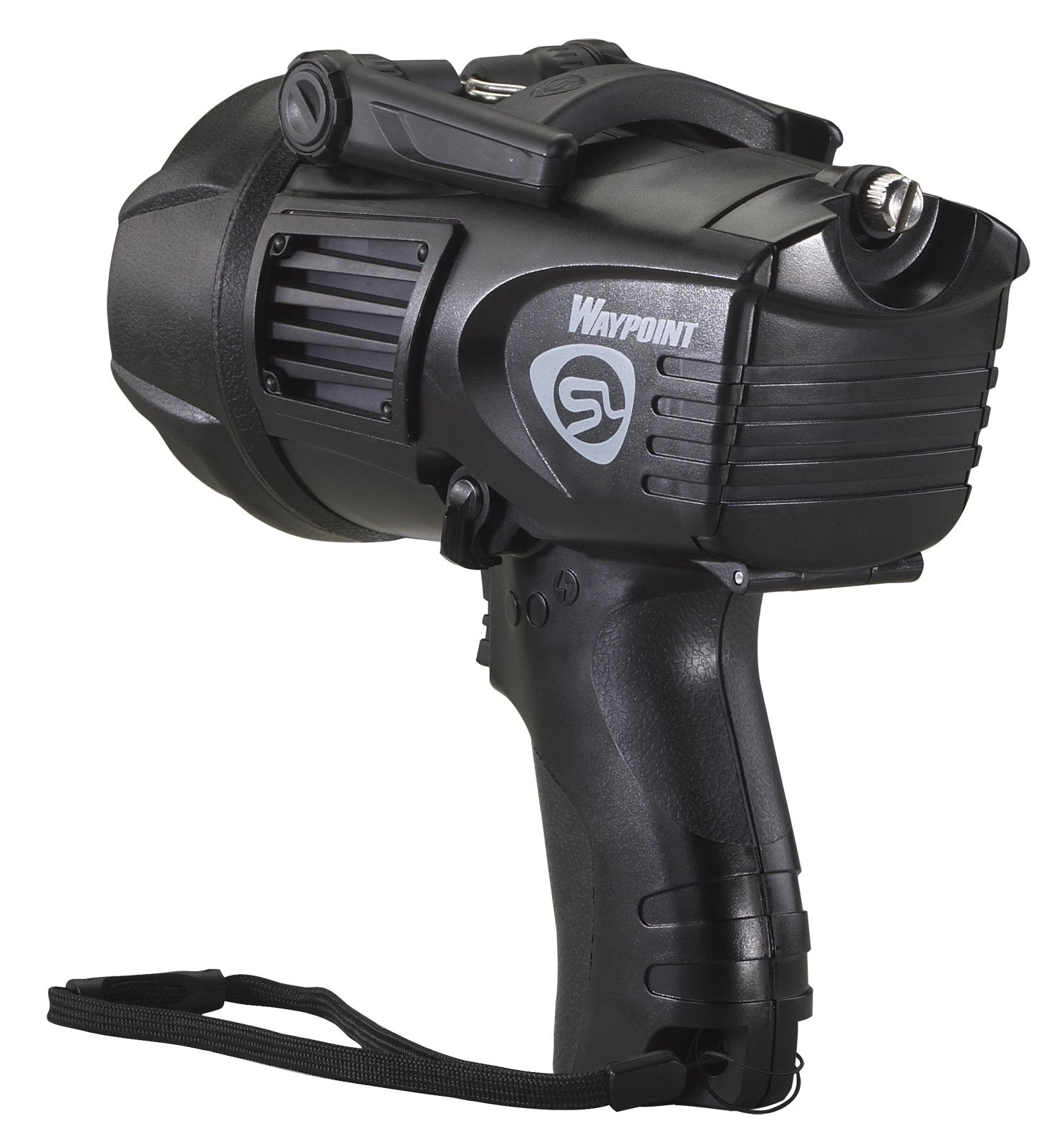 Handheld and powerful, the Streamlight Waypoint pistol-grip spotlight offers high and low intensity modes, emergency signal mode and the latest in power LED technology. The spotlight provides portability and long runtime using 4 "C" sized alkaline batteries or endless runtime with the 12VDC power cord; making the Waypoint the perfect choice for a variety of applications. Weight balanced design virtually eliminates user hand fatigue.
