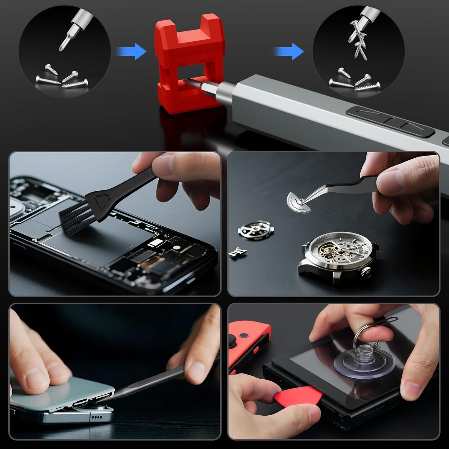 - Magnetic Design: We have added 2 magnetic tools in this mini electric screwdriver set to save your time and energy, making your fixing job easier. The magnetizer demagnetizer tool helps strengthen the magnetism of the screwdriver tips to grab screws, or weaken it to avoid damage to your sensitive electronics. The 5.7 x 3.3" magnetic project mat keeps all micro screws and parts organized, preventing loss and mes