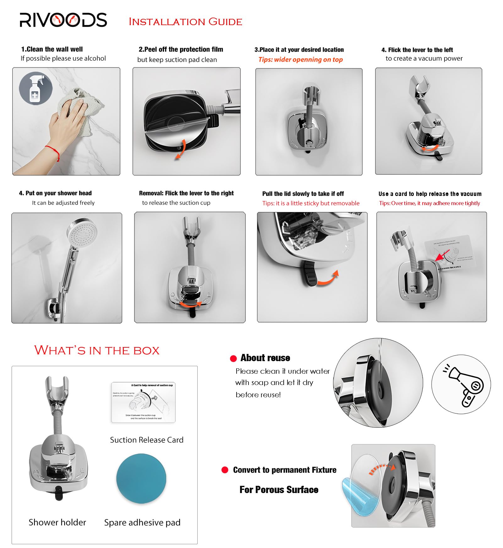 - 【INCLUDED ACCESSORIES】: 1.an acrylic adhesive pad for mounting on some slightly textured or porous surface, it can be removed without any residue. 2. A slick card to assist removal of suction cup, as it may adhere to wall tightly on some smooth walls.