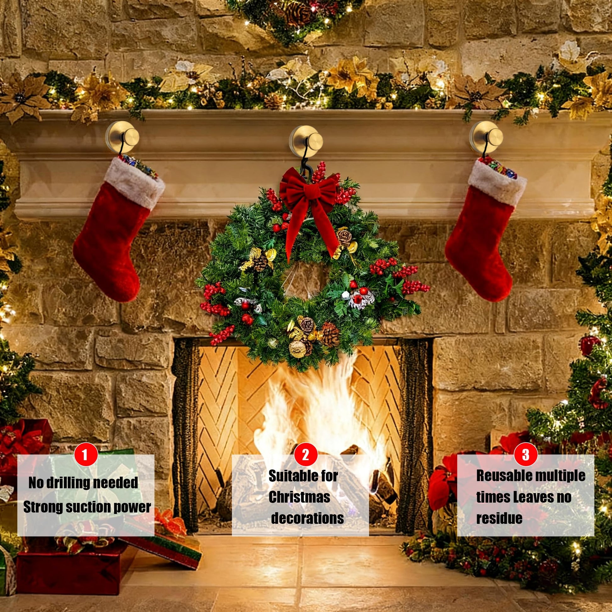 Suction Cup Hooks for Wreaths, 2025 New No Drill Suction Cup Hooks for Shower Hanging Towels, Wreath Hanger for Front Door, Holder for Glass Window Door Bathroom Mirrors (2pcs, Gold)