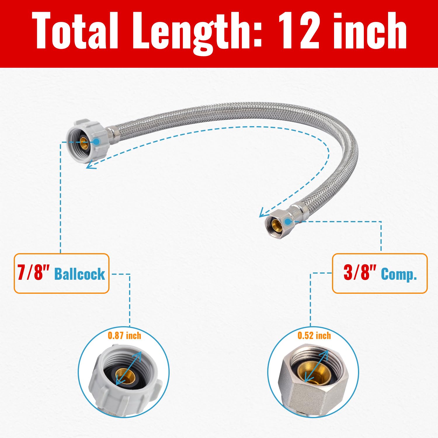 - 【12 Inch Toilet Line Connection】: 7/8" ballcock end for toilet tank, and 3/8" compression end is used to connect valve. Made of plastic, the 7/8" ballcock end is more suitable for plastic toilet fill valve. Meet CUPC and NSF requirements, our 12 inch toilet water supply hoses are safe to use.