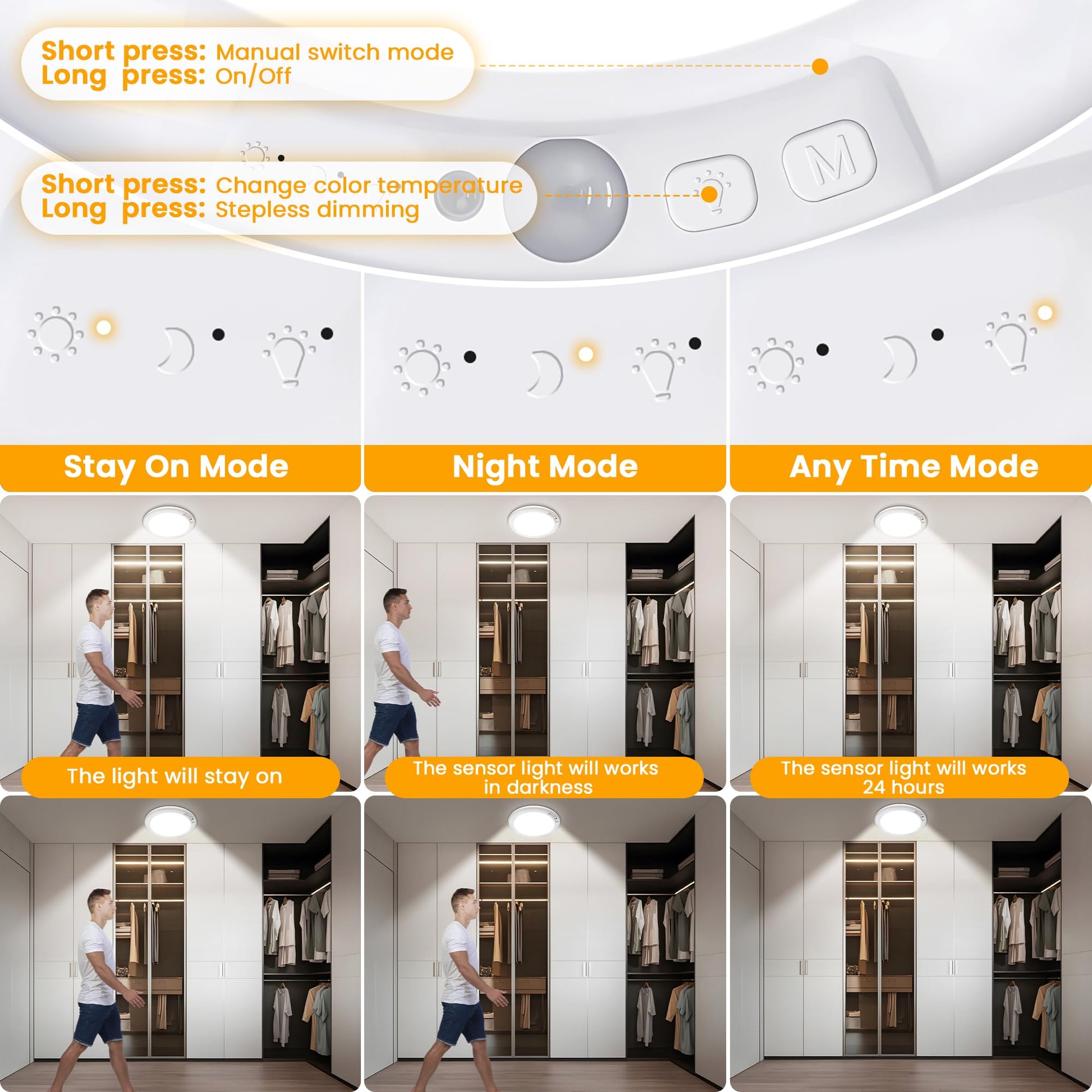 SunRider 4-Pack Rechargeable Motion Sensor LED Ceiling Light with Remote, Cordless Closet Lights Battery Operated, Dimmable 3CCT Magnetic Suction