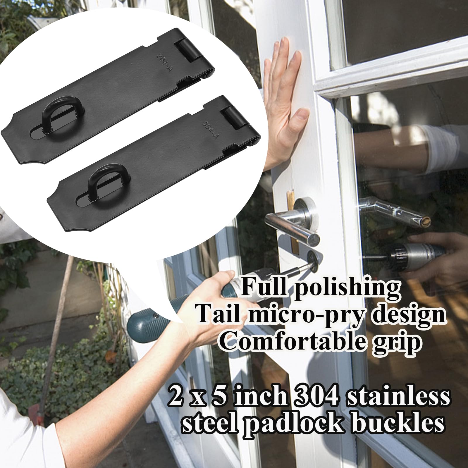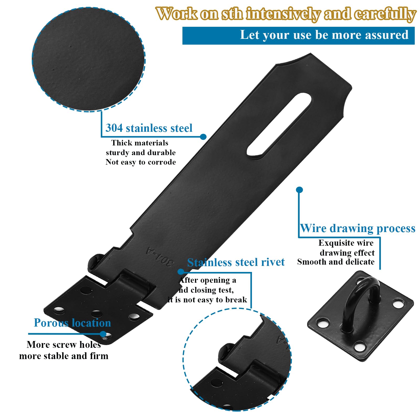 - 5 Inch black 304 stainless steel hasp latch set provides heavy-duty 2mm thick 304 stainless steel construction for superior security on gates, doors, and storage units. The complete set includes a combination lock, padlock, and 18 mounting screws for immediate installation