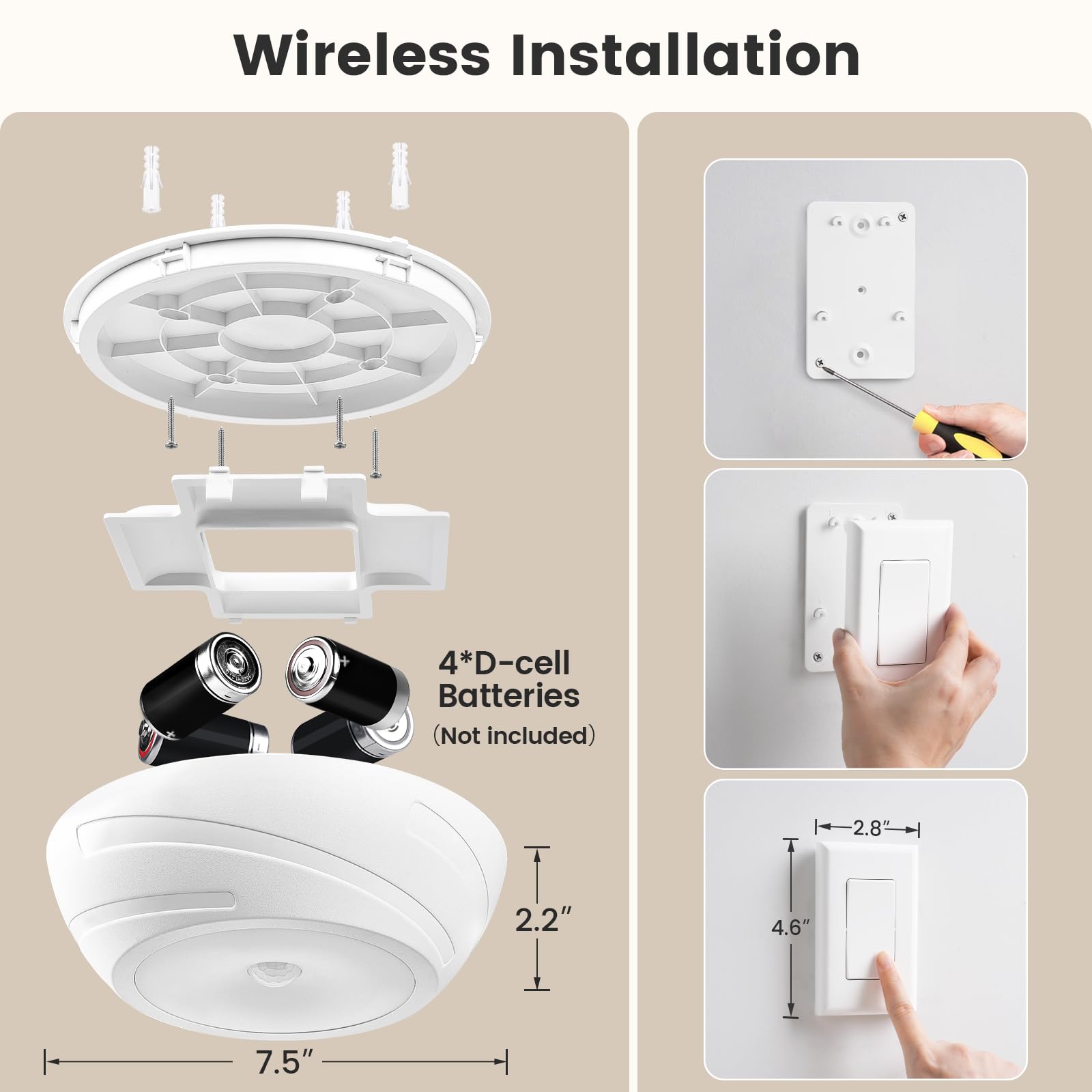 - Battery-Powered Convenience: The SURAIELEC battery ceiling light eliminates the hassle of wiring and installation with its 4 D-cell battery (NOT included) operation. Enjoy instant illumination without the need for complex electrical setups