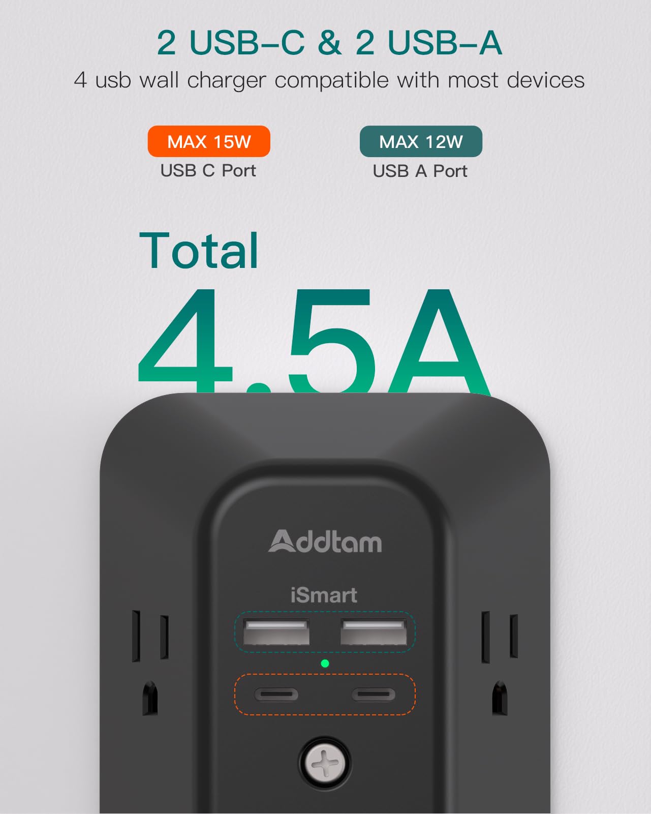 Surge Protector Outlet Extender, Addtam Multi Plug Wall Outlet with 4 USB Ports(2 USB-C), 3-Sided 1800J Power Strip Plug Extension Outlet Splitter, Black